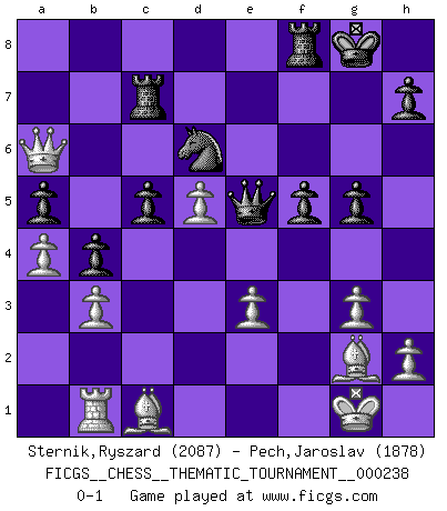 Last move : 0-1 2021 June 7 12:28:37 [Event "FICGS__CHESS__THEMATIC_TOURNAMENT__000238"] [Site "FICGS"] [Date "2020.10.16"] [Round "1"] [White "Sternik,Ryszard"] [Black "Pech,Jaroslav"] [Result "0-1"] [WhiteElo "2087"] [BlackElo "1878"] 1.c4 Nf6 2.Nc3 c5 3.g3 d5 4.cxd5 Nxd5 5.Bg2 Nc7 6.Nf3 Nc6 7.O-O e5 8.d3 Be7 9.Nd2 Bd7 10.Nc4 f6 11.f4 b5 12.Ne3 exf4 13.Rxf4 O-O 14.Nf5 Rc8 15.a4 b4 16.Nb5 Ne6 17.Re4 a6 18.Nbd6 Bxd6 19.Nxd6 Rc7 20.Nc4 g5 21.Nb6 Ned4 22.Nxd7 Rxd7 23.e3 Nf5 24.Qf1 Ng7 25.d4 f5 26.Re8 Nxe8 27.Bxc6 Rc7 28.Qc4+ Kg7 29.Bg2 Qd6 30.d5 a5 31.b3 Qe5 32.Rb1 Nd6 33.Qa6 Kg8 0-1 Follow this game move after move (download)That's what Chess is all about. One day you give your opponent a lesson, the next day he gives you one. (Bobby Fischer) Nur ein wirklich starker Spieler weiß wie schwach er spielt. (Savielly Grigorievitsch Tartakower) Todos los jugadores de Ajedrez deberían tener un pasatiempo. (Savielly Tartakower) Les Echecs sont et restent toujours un combat, un combat intégral comme la boxe, la lutte ou un autre sport, et où il doit y avoir un vainqueur et un vaincu. (Joseph Emil Diemer) Depression is just anger without enthusiasm. (Unknown)