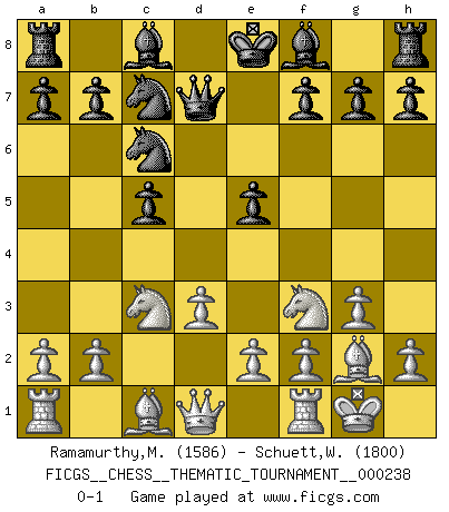 Last move : 0-1 2020 December 27 17:52:13 [Event "FICGS__CHESS__THEMATIC_TOURNAMENT__000238"] [Site "FICGS"] [Date "2020.10.16"] [Round "1"] [White "Ramamurthy,Murali"] [Black "Schuett,Wilhelm"] [Result "0-1"] [WhiteElo "1586"] [BlackElo "1800"] 1.c4 Nf6 2.Nc3 c5 3.g3 d5 4.cxd5 Nxd5 5.Bg2 Nc7 6.Nf3 Nc6 7.O-O Qd7 8.d3 e5 0-1 This chess game has been lost on time (started : 2020.10.16 13:42:29) Follow this game move after move (download)I have always a slight feeling of pity for the man who has no knowledge of Chess. (Siegbert Tarrasch) Besser ein falscher Plan, logisch durchgeführt, als gar kein Plan. (Viktor Kortschnoi) El arma más poderosa en el Ajedrez, es tener la próxima movida. (David Bronstein) Il (Jacob Murray) ne joue pas pour le bon coup, mais pour le meilleur. (Eloi Relange) No man has ever achieved immortality in his own life time. (Unknown)
