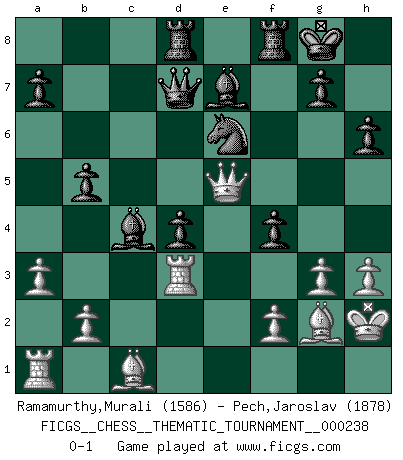 Last move : 0-1 2021 May 26 19:38:17 [Event "FICGS__CHESS__THEMATIC_TOURNAMENT__000238"] [Site "FICGS"] [Date "2020.10.16"] [Round "1"] [White "Ramamurthy,Murali"] [Black "Pech,Jaroslav"] [Result "0-1"] [WhiteElo "1586"] [BlackElo "1878"] 1.c4 Nf6 2.Nc3 c5 3.g3 d5 4.cxd5 Nxd5 5.Bg2 Nc7 6.Nf3 Nc6 7.O-O e5 8.d3 Be7 9.a3 O-O 10.e3 Bg4 11.h3 Be6 12.Qe2 Qd7 13.Kh2 Rad8 14.Rd1 Bb3 15.Rd2 b5 16.d4 cxd4 17.exd4 exd4 18.Ne4 f5 19.Neg5 h6 20.Ne6 Nxe6 21.Ne5 Nxe5 22.Qxe5 f4 23.Rd3 Bc4 0-1 This chess game has been lost on time (started : 2020.10.16 13:42:29) Follow this game move after move (download)I like the moment when I break a man's ego. (Bobby Fischer) Ich habe Putins Aufstieg an die Macht beobachtet und seine Politik, die demokratischen Institutionen meines Landes zu zerstören. (Garry Kasparov) Las Aperturas te enseñan aperturas. ¡Los Finales te enseñan Ajedrez!. (Stephan Gerzadowicz) Je menace de comprendre la position. (Anonyme) You have to believe in yourself. (Sun Tzu)