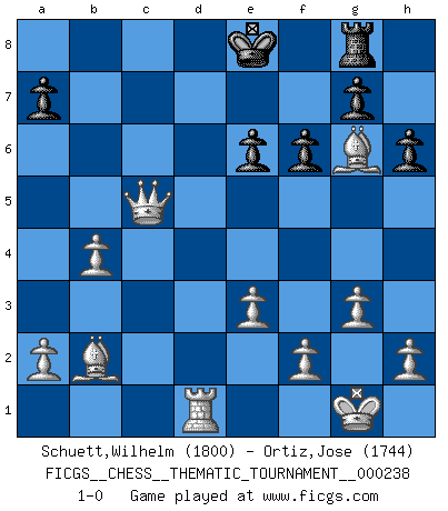 Last move : 1-0 2020 December 14 0:26:59 [Event "FICGS__CHESS__THEMATIC_TOURNAMENT__000238"] [Site "FICGS"] [Date "2020.10.16"] [Round "1"] [White "Schuett,Wilhelm"] [Black "Ortiz,Jose"] [Result "1-0"] [WhiteElo "1800"] [BlackElo "1744"] 1.c4 Nf6 2.Nc3 c5 3.g3 d5 4.cxd5 Nxd5 5.Bg2 Nc7 6.d3 e6 7.Qb3 Nd7 8.Nf3 b5 9.Nxb5 Rb8 10.Nxc7+ Qxc7 11.Qc2 Bd6 12.O-O h6 13.d4 Qb6 14.Rd1 Nf6 15.dxc5 Bxc5 16.e3 Bb7 17.Ne5 Rd8 18.Rxd8+ Qxd8 19.Bxb7 Qc7 20.Bc6+ Ke7 21.Qxc5+ Kd8 22.b4 Nd5 23.Bb2 f6 24.Ng6 Rg8 25.Rd1 Qf7 26.Bxd5 Qxg6 27.Be4 Ke8 28.Bxg6+ 1-0 Follow this game move after move (download)All I want to do, ever, is just play Chess. (Bobby Fischer) Ich habe die Schachforschung dermaßen betrieben, dass sie auf eine wissenschaftliche Basis gestellt wurde. (Mikhail Moiseyevich Botvinik) Solo el jugador con la iniciativa tiene el derecho a atacar. (Wilhelm Steinitz) La menace est plus forte que l'exécution. (Aaron Nimzovitch) The mind is like a parachute, it only functions when its open. (Unknown)
