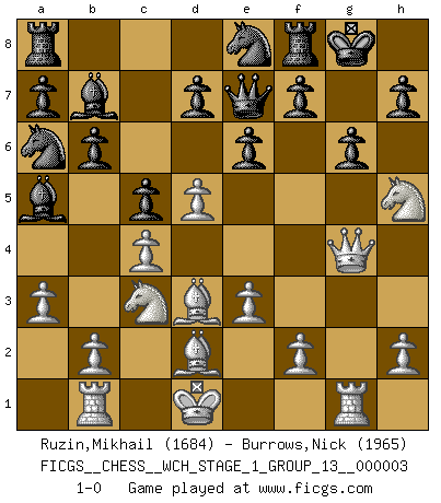 Last move : 1-0 2007 September 29 10:28:39 [Event "FICGS__CHESS__WCH_STAGE_1_GROUP_13__000003"] [Site "FICGS"] [Date "2007.07.11"] [Round "1"] [White "Ruzin,Mikhail"] [Black "Burrows,Nick"] [Result "1-0"] [WhiteElo "1684"] [BlackElo "1965"] 1.d4 Nf6 2.c4 e6 3.Nc3 Bb4 4.e3 b6 5.Nge2 c5 6.a3 Ba5 7.Rb1 Na6 8.Bd2 Bb7 9.Ng3 O-O 10.Bd3 Bxg2 11.Rg1 Bb7 12.Nh5 g6 13.d5 Ne8 14.Qg4 Qe7 15.Kd1 1-0 This chess game has been lost on time (started : 2007.07.11 17:9:35) Nimzo-Indian : Fischer variation Kingside Castling by player Black (move 9) Player White won this chess game. Follow this game move after move (download)We cannot resist the fascination of sacrifice, since a passion for sacrifices is part of a Chessplayer's nature. (Rudolf Spielman) Viele Opfer benötigen überhaupt keine konkrete Berechnung. Es genügt sich die entstehende Position kurz vorzustellen, um uns davon zu überzeugen, dass das Opfer korrekt ist. (Mikhail Nekhemyevich Tal) Los finales de Peón son del Ajedrez lo que el cesped es del Golf. (Cecil Purdy) Toute estimation doit être constamment réévaluée. (Jacob Estrin) There are two types of people in this world, good and bad. The good sleep better, but the bad seem to enjoy the waking hours much more. (Woody Allen)