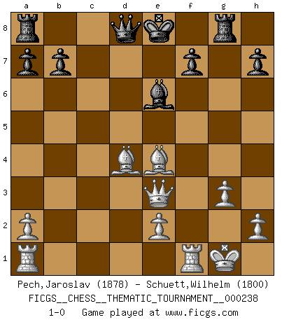 Last move : 1-0 2021 July 5 4:32:18 [Event "FICGS__CHESS__THEMATIC_TOURNAMENT__000238"] [Site "FICGS"] [Date "2020.10.16"] [Round "1"] [White "Pech,Jaroslav"] [Black "Schuett,Wilhelm"] [Result "1-0"] [WhiteElo "1878"] [BlackElo "1800"] 1.c4 Nf6 2.Nc3 c5 3.g3 d5 4.cxd5 Nxd5 5.Bg2 Nc7 6.d3 e6 7.Nf3 Nc6 8.O-O Be7 9.Be3 Nd5 10.Nxd5 exd5 11.d4 c4 12.b3 cxb3 13.Qxb3 Bf6 14.Ne5 Bxe5 15.dxe5 Nxe5 16.Bd4 Nc4 17.Bxg7 Rg8 18.Bd4 Nd2 19.Qe3+ Ne4 20.f3 Be6 21.fxe4 dxe4 22.Bxe4 1-0 Follow this game move after move (download)The passed Pawn is a criminal, who should be kept under lock and key. Mild measures, such as police surveillance, are not sufficient. (Aaron Nimzovich) Der vorletzte Fehler gewinnt. (Savielly Grigorievitsch Tartakower) Debemos de asegurarnos de que el Ajedrez no se convierta en un lenguaje muerto, muy interesante, pero solo para un grupo muy pequeño. (Sytze Faber) Le joueur d'Echecs qui veut atteindre le top est obligé de développer son propre credo créatif. Alexeï Stepanovicth Souétine. Il est facile d'écrire des livres ! Ce qui est difficile, c'est de jouer ! (Alexeï Stepanovicth Souétine) Programming can only do so much before it becomes too much. (Don Groves)