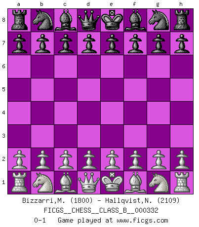 Last move : 0-1 2021 January 6 0:14:1 [Event "FICGS__CHESS__CLASS_B__000332"] [Site "FICGS"] [Date "2020.11.26"] [Round "1"] [White "Bizzarri,Matteo"] [Black "Hallqvist,Niklas"] [Result "0-1"] [WhiteElo "1800"] [BlackElo "2109"] 0-1 This chess game has been lost on time (started : 2020.11.26 13:18:52) Follow this game move after move (download)Life is like a game of Chess, changing with each move. (Chinese proverb) Computer sind die einzigen Gegner, die nicht immer eine Ausrede auf Lager haben, wenn sie gegen mich verlieren. (Robert James Fischer) No todos los artistas son jugadores de Ajedrez, pero todos los jugadores de Ajedrez son artistas. (Marcel Duchamp) Même si vous avez un bon coup à faire, regardez toujours s'il n'y en a pas un qui lui soit préférable. (Pedro Damiano) The production of too many useful things results in too many useless people. (Karl Marx)