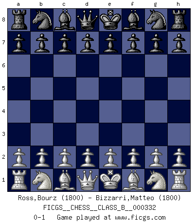 Last move : 0-1 2021 January 6 0:14:1 [Event "FICGS__CHESS__CLASS_B__000332"] [Site "FICGS"] [Date "2020.11.26"] [Round "1"] [White "Ross,Bourz"] [Black "Bizzarri,Matteo"] [Result "0-1"] [WhiteElo "1800"] [BlackElo "1800"] 0-1 This chess game has been lost on time (started : 2020.11.26 13:18:52) Follow this game move after move (download)We must make sure that Chess will not be like a dead language, very interesting, but for a very small group. (Sytze Faber) Der 70jährige Viktor Kortschnoi: Die Rentenanstalt wollte mich zwingen in Rente zu gehen. Meine Frau erhält jetzt eine Pension- und ich zahle weiter in die Rentenkasse ein! (Viktor Kortschnoi) No es suficiente ser un buen jugador, se debe también de jugar bién. (Siegbert Tarrasch) Il n'y a pas eu de défaite parce que je ne crois pas que cet ordinateur ait jamais existé. IBM a triché en refusant d'imprimer les modes de recherche de la machine. C'est évident, pendant le match, des coups décisifs ont été joués par des êtres humains. Aujourd'hui, les meilleurs spécialistes en informatique ne peuvent toujours pas expliquer comment Deep-Blue a pu jouer contre la logique des ordinateurs. IBM a gagné une guerre de communication, mais ils sont incapables de prouver que l'ordinateur a gagné tout seul. (Garry Kasparov) Horse racing is animated roulette. (Roger Kahn)