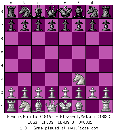 Last move : 1-0 2021 January 6 0:14:1 [Event "FICGS__CHESS__CLASS_B__000332"] [Site "FICGS"] [Date "2020.11.26"] [Round "1"] [White "Benone,Mateia"] [Black "Bizzarri,Matteo"] [Result "1-0"] [WhiteElo "1816"] [BlackElo "1800"] 1.Nf3 1-0 This chess game has been lost on time (started : 2020.11.26 13:18:52) Follow this game move after move (download)A good sacrifice is one that is not necessarily sound but leaves your opponent dazed and confused. (Rudolph Spielmann) Bis jetzt ist Weiß einer wohlbekannten Analyse gefolgt. Aber jetzt begeht er einen schrecklichen Fehler: Er beginnt seinen eigenen Kopf zu benutzen. (Siegbert Tarrasch) El Ajedrez es el arte del análisis. (Mikhail Botvinnik) Pour se monter efficace, un Cavalier a besoin d'avant-postes ! Les Cavaliers font les meilleurs bloqueurs de pions passés. Industry executives and analysts often mistakenly talk about strategy as if it were some kind of chess match. But in chess, you have just two opponents, each with identical resources, and with luck playing a minimal role. The real world is much more like a poker game, with multiple players trying to make the best of whatever hand fortune has dealt them. In our industry, Bill Gates owns the table until someone proves otherwise. (David Moschella, 'Computerworld')