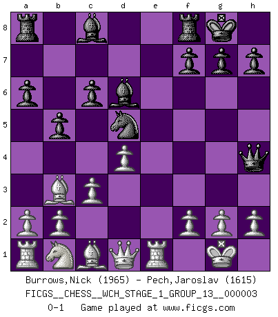 Last move : 0-1 2007 September 10 19:48:44 [Event "FICGS__CHESS__WCH_STAGE_1_GROUP_13__000003"] [Site "FICGS"] [Date "2007.07.11"] [Round "1"] [White "Burrows,Nick"] [Black "Pech,Jaroslav"] [Result "0-1"] [WhiteElo "1965"] [BlackElo "1615"] 1.e4 e5 2.Nf3 Nc6 3.Bb5 a6 4.Ba4 Nf6 5.O-O Be7 6.Re1 b5 7.Bb3 O-O 8.c3 d5 9.exd5 Nxd5 10.Nxe5 Nxe5 11.Rxe5 c6 12.d4 Bd6 13.Re1 Qh4 0-1 This chess game has been lost on time (started : 2007.07.11 17:9:35) Ruy Lopez : Closed, 7...O-O Kingside Castling by player White (move 5) Kingside Castling by player Black (move 7) Player Black won this chess game. Follow this game move after move (download)You sit at the board and suddenly your heart leaps. Your hand trembles to pick up the piece and move it. But what Chess teaches you is that you must sit there calmly and think about whether it's really a good idea and whether there are other better ideas. (Stanley Kubrick) Moralische Siege zählen nicht. (Savielly Grigorievitsch Tartakower) El ganador de una partida es aquel jugador que hace el penúltimo error. (Savielly Tartakover) Les Echecs, c'est l'art de la guerre sans les charniers, c'est la résurrection des morts tombés au champ d'honneur, l'espoir perpétuel, la suprématie de l'intelligence sur la force, la culture de l'esprit. (F. Szpiner) When the going gets tactical, the computers get going. (Hyatt)