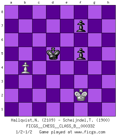 Last move : 1/2-1/2 2021 May 13 21:24:35 [Event "FICGS__CHESS__CLASS_B__000332"] [Site "FICGS"] [Date "2020.10.17"] [Round "1"] [White "Hallqvist,Niklas"] [Black "Scheijndel,Tobi"] [Result "1/2-1/2"] [WhiteElo "2109"] [BlackElo "1900"] 1.c4 Nf6 2.g3 e6 3.Bg2 d5 4.Nf3 dxc4 5.Qa4+ c6 6.Qxc4 b5 7.Qc2 Bb7 8.O-O Nbd7 9.a4 a6 10.Nc3 Be7 11.d4 O-O 12.Be3 Rc8 13.Ne4 Nxe4 14.Qxe4 Nf6 15.Qd3 c5 16.dxc5 Qxd3 17.exd3 Bxc5 18.axb5 axb5 19.Rfc1 Bxe3 20.fxe3 Bxf3 21.Bxf3 h5 22.h3 g5 23.Bb7 Rb8 24.Bc6 g4 25.Kg2 gxh3+ 26.Kxh3 Ng4 27.Rc5 Nxe3 28.Rg5+ Kh7 29.Kh4 Kh6 30.Rxh5+ Kg6 31.g4 Rh8 32.Be4+ Kf6 33.Ra7 Rxh5+ 34.gxh5 Rg8 35.h6 Rg4+ 36.Kh3 Rg5 37.h7 Rh5+ 38.Kg3 Nf5+ 39.Bxf5 exf5 40.Rb7 Rxh7 41.Rxb5 Kg5 42.b4 Rh1 43.d4 Rd1 44.d5 Rd3+ 45.Kf2 Kf4 46.Rc5 Ke4 47.Rb5 Rxd5 48.Rxd5 Kxd5 1/2-1/2 Follow this game move after move (download)One bad move nullifies forty good ones. (Horowitz) Es genügt nicht ein guter Spieler zu sein, man muß auch gut spielen. (Siegbert Tarrasch) Buenas posiciones no logran ganar juegos, buenas movidas sí. (Gerald Abrahams) J'ai toujours senti une vague pitié pour l'homme qui ne connaît rien aux échecs, tout comme j'en aurais pour un homme ignorant de l'amour. Les Echecs, comme la musique ou comme l'amour, ont le pouvoir de rendre heureux. (Siegbert Tarrasch) Memory is a crazy woman that hoards colored rags and throws away food. (Austin O'Malley)