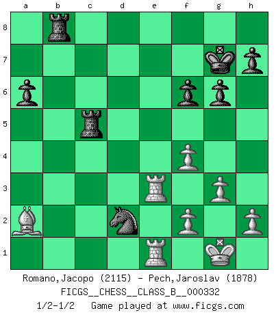 Last move : 1/2-1/2 2021 May 29 22:11:37 [Event "FICGS__CHESS__CLASS_B__000332"] [Site "FICGS"] [Date "2020.10.17"] [Round "1"] [White "Romano,Jacopo"] [Black "Pech,Jaroslav"] [Result "1/2-1/2"] [WhiteElo "2115"] [BlackElo "1878"] 1.Nf3 Nf6 2.c4 c5 3.Nc3 Nc6 4.g3 d5 5.d4 e6 6.cxd5 Nxd5 7.Bg2 Be7 8.O-O O-O 9.Nxd5 exd5 10.dxc5 Bxc5 11.Bg5 f6 12.Bd2 Qe7 13.Bc3 Rd8 14.Bd4 b6 15.Rc1 Bg4 16.Bxc5 bxc5 17.Qa4 Bxf3 18.exf3 Qd6 19.f4 Rab8 20.Rfd1 Nd4 21.Re1 a6 22.Qa5 Rdc8 23.b3 g6 24.Re3 Kg7 25.Rce1 c4 26.Kf1 cxb3 27.axb3 Nxb3 28.Qxd5 Nd2+ 29.Kg1 Qxd5 30.Bxd5 Rc5 31.Ba2 1/2-1/2 Follow this game move after move (download)If you aren't afraid of Spassky, then I have removed the element of money. (Jim Slater) Schach verlangt totale Konzentration. (Robert James Fischer) En un gambito tu regalas un Peón por el bién de tomar un juego perdido. (Samuel Standige Boden) Le jeu d'échecs fait naître et fortifie en nous plusieurs qualités précieuses dans le cours de l'existence, telles que la prévoyance, la circonspection, la prudence, et la persévérance. (Benjamin Franklin - 1783, la morale des échecs) What doesn't kill us makes us stronger. (Friedrich Nietzsche)