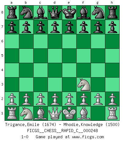 Last move : 1-0 2020 November 21 0:11:45 [Event "FICGS__CHESS__RAPID_C__000248"] [Site "FICGS"] [Date "2020.10.21"] [Round "1"] [White "Trigance,Emile"] [Black "Mhodie,Knowledge"] [Result "1-0"] [WhiteElo "1674"] [BlackElo "1500"] 1.Nf3 1-0 This chess game has been lost on time (started : 2020.10.21 18:20:53) Follow this game move after move (download)White lost because he failed to remember the right continuation and had to think up the moves himself. (Siegbert Tarrasch) Der beste Spieler in einem Turnier gewinnt es nie. Er landet auf Platz zwei oder drei. (Siegbert Tarrasch) Una mala movida nulifica cuarenta buenas. (Horowitz) Même si vous avez un bon coup à faire, regardez toujours s'il n'y en a pas un qui lui soit préférable. (Pedro Damiano) To steal ideas from one person is plagiarism. To steal from many is research. (Unknown)