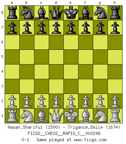 Last move : 0-1 2020 November 21 0:11:45 [Event "FICGS__CHESS__RAPID_C__000248"] [Site "FICGS"] [Date "2020.10.21"] [Round "1"] [White "Hasan,Shariful"] [Black "Trigance,Emile"] [Result "0-1"] [WhiteElo "1500"] [BlackElo "1674"] 0-1 This chess game has been lost on time (started : 2020.10.21 18:20:53) Follow this game move after move (download)It was clear to me that the vulnerable point of the American Grandmaster (Bobby Fischer) was in double-edged, hanging, irrational positions, where he often failed to find a win even in a won position. (Efim Geller) Kritik überlasse ich den Spießern. Ich zeige nichts, wofür ich mich schämen muss. (Alexandra Kosteniuk) Alguna parte de un error es siempre correcto. (Savielly Tartakover) Aux échecs, les retours au sommet sont rares : les dommages psychologiques consécutifs à une défaite sont trop sévères. (Daily Telegraph) Winning isn't everything... but losing is nothing. (Mednis)