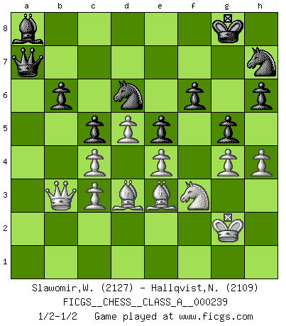 Last move : 1/2-1/2 2021 January 6 12:24:39 [Event "FICGS__CHESS__CLASS_A__000239"] [Site "FICGS"] [Date "2020.10.21"] [Round "1"] [White "Slawomir,Weglicki"] [Black "Hallqvist,Niklas"] [Result "1/2-1/2"] [WhiteElo "2127"] [BlackElo "2109"] 1.d4 e6 2.c4 b6 3.e4 Bb4+ 4.Nc3 Bb7 5.f3 Bxc3+ 6.bxc3 Qh4+ 7.g3 Qe7 8.Bd3 d6 9.Ne2 Nf6 10.O-O c5 11.Be3 Nc6 12.Nc1 h6 13.Nb3 Rc8 14.Nd2 Na5 15.f4 e5 16.d5 Ba6 17.fxe5 dxe5 18.Qe2 Rd8 19.Nb3 Nb7 20.a4 Nd6 21.a5 Bc8 22.axb6 axb6 23.Qg2 O-O 24.h3 Bb7 25.g4 Nh7 26.Rfb1 Ra8 27.Nd2 Rxa1 28.Rxa1 f6 29.Nf3 Rb8 30.Qb2 Qc7 31.Ra7 Ra8 32.Rxa8+ Bxa8 33.h4 g5 34.Kg2 Qa7 35.Qb3 1/2-1/2 Follow this game move after move (download)My God, Bobby Fischer plays so simply. (Alexei Suetin) Ich glaube, ich kenne inzwischen die Gründe für mein Versagen: schachliche Charakterfehler. Ich war nie ein Wunderkind und in meiner gesamten menschlichen Entwicklung immer zu langsam. (Viktor Kortschnoi) Creo que una cierta cantidad de temperamento es esperada de los genios del Ajedrez. (Ron Gross) Seul un grand joueur sait à quel point il joue faiblement. (Xavier Tartacover) Fortune favours the audacious. (Desiderius Erasmus)