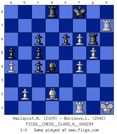 Last move : 1-0 2021 February 5 21:5:58 [Event "FICGS__CHESS__CLASS_A__000239"] [Site "FICGS"] [Date "2020.10.21"] [Round "1"] [White "Hallqvist,Niklas"] [Black "Borisovs,Leonids"] [Result "1-0"] [WhiteElo "2109"] [BlackElo "2042"] 1.c4 g6 2.g3 Bg7 3.Bg2 Nf6 4.Nc3 O-O 5.d4 d6 6.Nf3 Nbd7 7.O-O e5 8.e4 c6 9.h3 Qb6 10.c5 dxc5 11.dxe5 Ne8 12.e6 fxe6 13.Ng5 Ne5 14.f4 Nf7 15.Nxf7 Bd4+ 16.Kh2 Rxf7 17.e5 Rd7 18.Qc2 Nc7 19.Ne4 Nd5 20.h4 Re7 21.a4 a5 22.g4 Qb4 23.g5 Kh8 24.Nf6 Bd7 25.Ra3 Rd8 26.Be4 Be8 27.h5 gxh5 28.Rh3 b5 29.Kh1 Rg7 30.Nxh7 Qc4 31.Qxc4 bxc4 32.Nf6 Bg6 33.Bxg6 Rxg6 34.Rxh5+ Kg7 35.Rh7+ Kf8 36.Bd2 Nxf6 37.exf6 1-0 Follow this game move after move (download)Chess is no whit inferior to the violin, and we have a large number of professional violinists. (Mikhail Botvinnik) Mit sehr nachdenklichem Gesicht schreitet Bobby durch den Turniersaal. Was ist passiert?, fragt Lombardy. Ich stehe schlecht, antwortet Fischer. Lombardy: Dann biete doch einfach Remis an. Fischer: So schlecht stehe ich nun auch wieder nicht! (Robert James Fischer) La táctica fluye a partir de una posición superior. (Bobby Fischer) Lorsque vous vous retrouvez devant une position atroce, ne tendez pas un ultime piège dérisoire avec l'intention d'abandonner si l'adversaire le déjoue ! Faites-vous plutôt un devoir de résister comme si votre vie en dépendait. Jouez le coup qui vous déplairait au centuple si vous étiez dans la peau de votre tortionnaire ! Go and wake up your luck. (Persian saying)