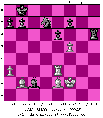 Last move : 0-1 2020 November 13 13:34:11 [Event "FICGS__CHESS__CLASS_A__000239"] [Site "FICGS"] [Date "2020.10.21"] [Round "1"] [White "Cleto Junior,Dirceu"] [Black "Hallqvist,Niklas"] [Result "0-1"] [WhiteElo "2104"] [BlackElo "2109"] 1.e4 e6 2.d4 d5 3.Nc3 Bb4 4.e5 c5 5.a3 Bxc3+ 6.bxc3 Ne7 7.Qg4 cxd4 8.Qxg7 Rg8 9.Qxh7 Qc7 10.Ne2 dxc3 11.f4 Nbc6 12.Qd3 d4 13.Nxd4 Nxd4 14.Qxd4 Bd7 15.Rg1 Nf5 16.Qf2 Qc6 17.Bd3 Qd5 18.Rb1 O-O-O 19.Rb3 Bc6 20.Rxc3 Kb8 21.g4 Nd4 22.Rg3 Qh1+ 23.Qf1 Nf3+ 24.Kf2 Qxh2+ 25.Qg2 Qxg2+ 26.Kxg2 Nxe5 27.Kf2 Nxg4+ 28.Ke1 Nf6 29.Rxg8 Rxg8 30.Bb2 Nd7 31.Be2 Ba4 32.Kf2 Rh8 33.Re3 Rh6 34.f5 Bxc2 0-1 Follow this game move after move (download)I have always a slight feeling of pity for the man who has no knowledge of Chess. (Siegbert Tarrasch) Dass jemand wie Surab Asmaiparaschwili, der selbst Elopunkte gekauft hat , Vize-Präsident der Fide werden konnte, sagt schon einges über den Zustand dieser Organisation aus. (Joel Lautier) Una buena memoria, concentración, imaginación y una fuerte voluntad, se requiere para llegar a ser un buen jugador. (Bobby Fischer) Psychologiquement, tu dois avoir confiance en toi même, mais cette confiance doit être basée sur des faits. (Robert Fischer) Excelling at chess has long been considered a symbol of more general intelligence. That is an incorrect assumption in my view, as pleasant as it might be. But for the purposes of argument and investigation, chess is, in Russkin-Gutman's words, 'an unparalleled laboratory, since both the learning process and the degree of ability obtained can be objectified and quantified, providing an excellent comparative framework on which to use rigorous analytical techniques.' (The Chess Master and the Computer, by Garry Kasparov - 2010)
