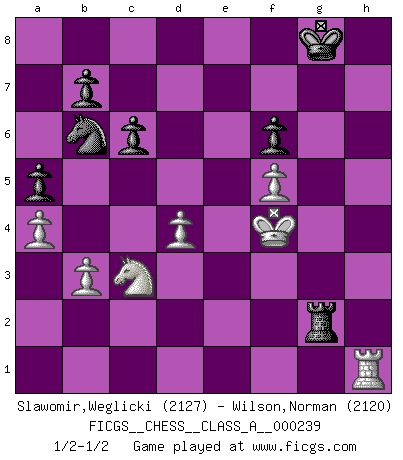 Last move : 1/2-1/2 2020 November 13 7:34:47 [Event "FICGS__CHESS__CLASS_A__000239"] [Site "FICGS"] [Date "2020.10.21"] [Round "1"] [White "Slawomir,Weglicki"] [Black "Wilson,Norman"] [Result "1/2-1/2"] [WhiteElo "2127"] [BlackElo "2120"] 1.d4 Nf6 2.c4 e6 3.Nc3 d5 4.cxd5 exd5 5.Bg5 c6 6.e3 h6 7.Bh4 Be7 8.Bd3 Nbd7 9.Qc2 Nh5 10.Bxe7 Qxe7 11.Nge2 Nb6 12.h3 g6 13.O-O O-O 14.Rae1 Ng7 15.Ng3 Be6 16.f3 Rae8 17.Qd2 Qg5 18.Qf2 h5 19.f4 Qh4 20.b3 Nf5 21.Kh2 Nxg3 22.Qxg3 Qxg3+ 23.Kxg3 Bf5 24.e4 dxe4 25.Bxe4 f6 26.Bxf5 gxf5 27.a4 a5 28.Rd1 Re3+ 29.Rf3 Rxf3+ 30.Kxf3 Rd8 31.g4 hxg4+ 32.hxg4 fxg4+ 33.Kxg4 Kf7 34.f5 Rg8+ 35.Kf4 Rg2 36.Rh1 Kg8 1/2-1/2 Follow this game move after move (download)There's never before been a Chess player with such a thorough knowledge of the intricacies of the game and such an absolutely indomitable will to win. I think Bobby is the greatest player that ever lived. (Lisa Lane) Die Neutralität betrachte ich als eine schwere Krankheit. (Viktor Kortschnoi) Bobby solo arroja las piezas y solas caen en las casillas correctas. (Miguel Najdorf ) Si le désir cupide (et stupide) de gagner est une inépuisable source de souffrance, une combinaison brillante sur l'échiquier est une découverte : le coquelicot qui s'épanouit lorsque apparaît la Voie Lactée. (Arrabal) It's not enough to succeed. Others must fail. (Gore Vidal)
