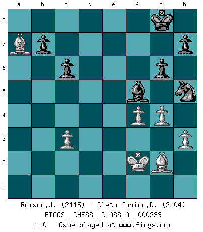 Last move : 1-0 2021 January 22 19:5:20 [Event "FICGS__CHESS__CLASS_A__000239"] [Site "FICGS"] [Date "2020.10.21"] [Round "1"] [White "Romano,Jacopo"] [Black "Cleto Junior,Dirceu"] [Result "1-0"] [WhiteElo "2115"] [BlackElo "2104"] 1.d4 Nf6 2.c4 g6 3.g3 Bg7 4.Bg2 O-O 5.Nc3 d6 6.Nf3 Nbd7 7.O-O e5 8.e4 c6 9.h3 Qb6 10.Re1 exd4 11.Nxd4 Re8 12.Re2 Qa5 13.Be3 Ne5 14.c5 dxc5 15.Nb3 Qc7 16.f4 Rd8 17.Rd2 Rxd2 18.Nxd2 Nd3 19.Nc4 Nb4 20.Bxc5 Be6 21.Bd6 Qd8 22.Bxb4 Bxc4 23.Bc5 Qxd1+ 24.Rxd1 Nh5 25.Kf2 Bxc3 26.bxc3 Bxa2 27.Ra1 Be6 28.Rxa7 Rxa7 29.Bxa7 f5 30.exf5 Bxf5 31.g4 1-0 Follow this game move after move (download)A strong memory, concentration, imagination, and a strong will is required to become a great Chess player. (Bobby Fischer) Sie bekommen vielleicht den Eindruck, dass die Spitzenspieler überhaupt gar nicht so stark sind. Aber das stimmt nicht. Es ist eine Illusion. Mit einem Computer an der Seite ist es sehr leicht, Urteile zu fällen, aber wenn man alleine am Brett sitzt, sieht die Sache ganz anders aus. (Vladimir Kramnik) Puntos débiles o agujeros en la posición de tu oponente deben de ser ocupados por piezas, no Peones. (Siegbert Tarrasch) La conception d'un plan est le processus par lequel un joueur exploite les avantages de sa position tout en s'efforçant d'en réduire au minimum les inconvénients. Afin de garantir le succès, un plan doit toujours se fonder sur un diagnostic objectif des particularités d'une position. La conception d'un plan est d'autant plus difficile que la position est équilibrée, et grandement facilitée lorsqu'il n'existe qu'un seul plan susceptible de répondre aux exigences de la position. (Harry Golombek) In God we trust, all others we virus scan. (Anonymous)