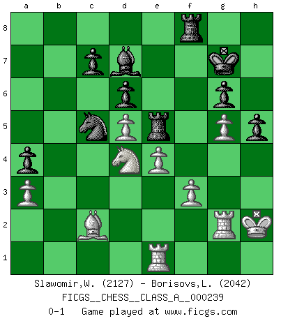 Last move : 0-1 2021 March 20 22:6:12 [Event "FICGS__CHESS__CLASS_A__000239"] [Site "FICGS"] [Date "2020.10.21"] [Round "1"] [White "Slawomir,Weglicki"] [Black "Borisovs,Leonids"] [Result "0-1"] [WhiteElo "2127"] [BlackElo "2042"] 1.Nf3 Nf6 2.c4 g6 3.Nc3 Bg7 4.e4 d6 5.d4 O-O 6.Be2 Na6 7.O-O e5 8.Re1 exd4 9.Nxd4 Nc5 10.f3 Nh5 11.Be3 Qh4 12.Bf2 Qg5 13.h4 Qe7 14.Nd5 Qd8 15.g4 Nf6 16.Qc1 h5 17.g5 Nxd5 18.cxd5 a5 19.Bc4 f6 20.gxf6 Qxf6 21.Qg5 Qxg5+ 22.hxg5 Bh3 23.Rac1 Rae8 24.b3 Rf7 25.Rc2 Be5 26.Rd1 Kh7 27.Be3 Bd7 28.Kg2 b6 29.Rf2 Bf4 30.Bxf4 Rxf4 31.Kg3 Rf7 32.Rg2 b5 33.Bd3 Re5 34.Kh2 Kg7 35.a3 a4 36.bxa4 bxa4 37.Bc2 Rf4 38.Rb1 Rf8 39.Rb4 Re7 40.Rb1 Re5 41.Rb2 R5e8 42.Bd1 Rb8 43.Rb4 Kg8 44.Rgb2 Rbe8 45.Rd2 Rf4 46.Bc2 Rh4+ 47.Kg1 Rf4 48.Rf2 Re5 49.Rg2 Re8 50.Rb1 R4f8 51.Kh2 Kg7 52.Re1 Re5 0-1 Follow this game move after move (download)It's just you and your opponent at the board and you're trying to prove something. (Bobby Fischer) Ich liebe den Moment, wenn ich das Ego meines Gegenüber breche. (Robert James Fischer) El Ajedrez es de 30 a 40 por ciento psicología. Uno no cuenta con esto cuando se juega contra una computadora. No lo puedo confundir. (Judith Polgar) Que feriez-vous si vous étiez en train de jouer aux échecs et que la fin du monde arrive ? Je continuerais à jouer. (Saint Borromée) I would love to change the world, but they won't give me the source code. (Unknown)