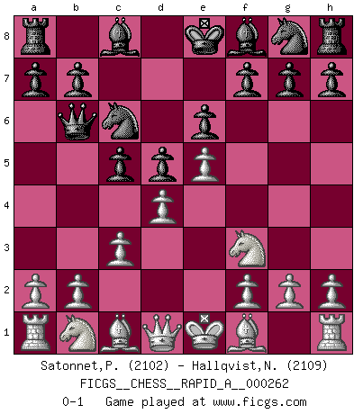 Last move : 0-1 2021 January 1 14:22:11 [Event "FICGS__CHESS__RAPID_A__000262"] [Site "FICGS"] [Date "2020.10.24"] [Round "1"] [White "Satonnet,Patrick"] [Black "Hallqvist,Niklas"] [Result "0-1"] [WhiteElo "2102"] [BlackElo "2109"] 1.e4 e6 2.d4 d5 3.e5 c5 4.c3 Nc6 5.Nf3 Qb6 0-1 This chess game has been lost on time (started : 2020.10.24 16:20:43) Follow this game move after move (download)All my games are real. (Bobby Fischer) Ich liebe den Moment, wenn ich das Ego meines Gegenüber breche. (Robert James Fischer) El juego de Fischer siempre fue nítido, racional y brillante. Uno de los mejores por siempre. (Dave Regis) Nous sommes les pions de la mystérieuse partie d'Echecs jouée par Dieu. Il nous déplace, nous arrête, nous pousse encore, puis nous lance un à un dans la boîte du Néant. Epitaphe sur la tombe de David Janowsky (1868-1927). I have opinions of my own - strong opinions - but I don't always agree with them. (George Bush)