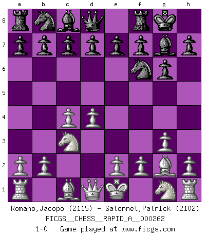 Last move : 1-0 2020 December 26 2:10:4 [Event "FICGS__CHESS__RAPID_A__000262"] [Site "FICGS"] [Date "2020.10.24"] [Round "1"] [White "Romano,Jacopo"] [Black "Satonnet,Patrick"] [Result "1-0"] [WhiteElo "2115"] [BlackElo "2102"] 1.d4 Nf6 2.c4 g6 3.g3 Bg7 4.Bg2 O-O 5.Nc3 1-0 This chess game has been lost on time (started : 2020.10.24 16:20:43) Follow this game move after move (download)One of these modest little moves may be more embarrassing to your opponent than the biggest threat. (Siegbert Tarrasch) Wie ich sie so einen nach dem anderen nieder mähte wurde meine Überlegenheit offensichtlich. (José Raúl Capablanca) El Ajedrez es una hermosa aventura. (Bent Larsen) En blitz, le Cavalier l'emporte sur le Fou. (Vlastimil Hort) To steal ideas from one person is plagiarism. To steal from many is research. (Unknown)
