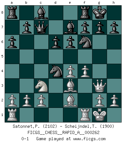 Last move : 0-1 2020 December 21 21:40:50 [Event "FICGS__CHESS__RAPID_A__000262"] [Site "FICGS"] [Date "2020.10.24"] [Round "1"] [White "Satonnet,Patrick"] [Black "Scheijndel,Tobi"] [Result "0-1"] [WhiteElo "2102"] [BlackElo "1900"] 1.e4 c5 2.Nf3 e6 3.d4 cxd4 4.Nxd4 Nc6 5.Nc3 Qc7 6.Be2 a6 7.O-O Nf6 8.Be3 Be7 9.f4 d6 10.Qe1 O-O 11.Qg3 Nxd4 0-1 This chess game has been lost on time (started : 2020.10.24 16:20:43) Follow this game move after move (download)There are two classes of men; those who are content to yield to circumstances and who play whist; those who aim to control circumstances, and who play Chess. (Mortimer Collins) Du musst nicht gut spielen, es reicht, wenn du besser spielst als dein Gegner. (Anonymous) Uno no tiene que jugar muy bien, es suficiente jugar mejor que el oponente. (Siegbert Tarrasch) Je ne suis pas le dernier à jouer lâchement des coups douteux pendant le zeïtnot de l'adversaire pour l'achever: en effet les coups qui font le plus peur sont ceux que l'on ne comprend pas. Je me fais souvent peur quand je joue. (Un professeur anonyme) Chess is everything: art, science and sport. (Anatoly Karpov)