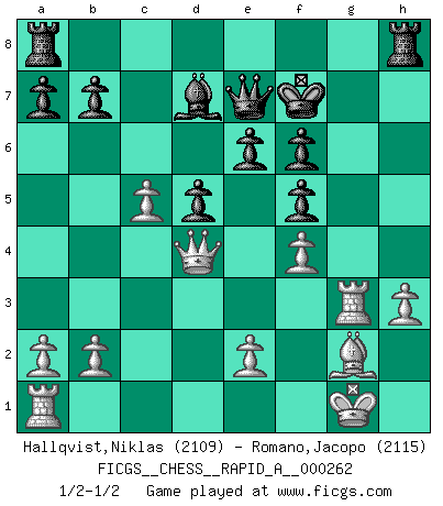 Last move : 1/2-1/2 2021 January 18 20:5:58 [Event "FICGS__CHESS__RAPID_A__000262"] [Site "FICGS"] [Date "2020.10.24"] [Round "1"] [White "Hallqvist,Niklas"] [Black "Romano,Jacopo"] [Result "1/2-1/2"] [WhiteElo "2109"] [BlackElo "2115"] 1.c4 c5 2.g3 g6 3.Bg2 Bg7 4.Nc3 Nc6 5.Nf3 e6 6.d4 Nxd4 7.Nxd4 cxd4 8.Ne4 d5 9.Qa4+ Kf8 10.Qa3+ Qe7 11.Nd6 Be5 12.c5 h5 13.O-O h4 14.h3 hxg3 15.fxg3 f6 16.Qd3 Kg7 17.Bf4 Bxf4 18.gxf4 Nh6 19.Rf3 Nf5 20.Nxf5+ gxf5 21.Rg3+ Kf7 22.Qxd4 Bd7 1/2-1/2 Follow this game move after move (download)You are for me the Queen on d8 and I am the Pawn on d7 !! (Eduard Gufeld) Es ist besser die Steine des Gegners zu opfern. (Savielly Grigorievitsch Tartakower) Debes de llevar a tu oponente hacia un profundo y obscuro bosque donde 2+2=5, y el camino que conduce a la salida es suficientemente ancho para solamente uno. (Mikhail Tal) Shah mat. Le roi est mort. Cri de fierté d'un joueur venant de terrasser son adversaire, courtoisement, sans effusion de sang. Looking at the proliferation of personal web pages on the Net, it looks like very soon everyone on Earth will have 15 megabytes of fame. (M.G. Sriram)