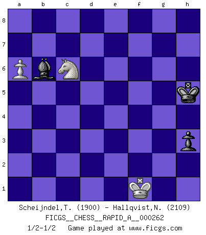 Last move : 1/2-1/2 2021 January 30 18:21:8 [Event "FICGS__CHESS__RAPID_A__000262"] [Site "FICGS"] [Date "2020.10.24"] [Round "1"] [White "Scheijndel,Tobi"] [Black "Hallqvist,Niklas"] [Result "1/2-1/2"] [WhiteElo "1900"] [BlackElo "2109"] 1.Nf3 c5 2.c4 g6 3.d4 cxd4 4.Nxd4 Nf6 5.Nc3 d5 6.Nf3 Be6 7.e3 Bg7 8.Ng5 Nc6 9.Nxe6 fxe6 10.cxd5 exd5 11.g3 e5 12.Bh3 O-O 13.O-O Kh8 14.Bg2 e4 15.Bd2 Ne5 16.Ne2 Nf3+ 17.Bxf3 exf3 18.Nd4 Ne4 19.Bb4 Rf7 20.Nxf3 Bxb2 21.Rb1 Bg7 22.Nd2 a5 23.Nxe4 axb4 24.Nc5 Bc3 25.Nd3 d4 26.Qb3 Qf6 27.Rbd1 Ra3 28.Qd5 Ra6 29.exd4 Rd6 30.Qb3 Bxd4 31.Nf4 g5 32.Nd5 Qe5 33.Nxb4 Kg7 34.Rd2 h5 35.Nc2 Ba7 36.Rxd6 Qxd6 37.Ne3 Qe5 38.Re1 h4 39.Re2 h3 40.Kf1 Qe4 41.Qd5 Qxd5 42.Nxd5 Rf3 43.Rc2 Kh6 44.Nc7 Rf5 45.a4 Ra5 46.Rc4 Rf5 47.f4 gxf4 48.Rxf4 Rxf4+ 49.gxf4 Kh5 50.Ne6 Bb8 51.a5 Bd6 52.Nd8 Bxf4 53.Nxb7 Bxh2 54.a6 Bb8 55.Na5 Ba7 56.Nc6 Bb6 1/2-1/2 Follow this game move after move (download)Chess is a matter of delicate judgment, knowing when to punch and how to duck. (Bobby Fischer) Ich erzeugte keinen Neid, da mich die Schachspieler als Musiker und die Musiker als Schachspieler betrachteten. (Mark Taimanov) El Ajedrez hace al hombre ser mas sabio y ver mas claro. (Vladimir Putin) Tous ces prétendus hommes politiques sont les pions, les Cavaliers, les Tours ou les Fous d'une partie d'échecs qui se jouera tant qu'un hasard ne renversera pas l'échiquier. (Honoré de Balzac) I just play for fun. (Anna Kournikova)