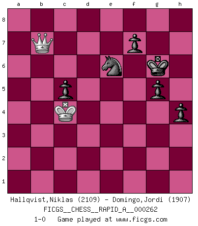 Last move : 1-0 2021 April 7 13:40:22 [Event "FICGS__CHESS__RAPID_A__000262"] [Site "FICGS"] [Date "2020.10.24"] [Round "1"] [White "Hallqvist,Niklas"] [Black "Domingo,Jordi"] [Result "1-0"] [WhiteElo "2109"] [BlackElo "1907"] 1.c4 e6 2.g3 d5 3.Bg2 Nf6 4.Nf3 c6 5.Qc2 Nbd7 6.O-O Bd6 7.d4 O-O 8.Nbd2 Re8 9.Rd1 Qe7 10.Re1 e5 11.cxd5 Nxd5 12.e4 Nb4 13.Qb1 exd4 14.a3 Na6 15.e5 Bc7 16.b4 Qd8 17.Nc4 Nb6 18.Rd1 Nxc4 19.Rxd4 Qxd4 20.Nxd4 Bxe5 21.Qd3 Rd8 22.Qxc4 Bxd4 23.Bg5 Be6 24.Qf1 Rd7 25.Rd1 Nc7 26.Be3 Bxe3 27.Rxd7 Bxf2+ 28.Qxf2 Bxd7 29.a4 Ne6 30.a5 b6 31.Qd2 Rd8 32.Qd6 bxa5 33.bxa5 c5 34.Qe7 a6 35.Bf1 Bc8 36.Kf2 g6 37.Bc4 Rd4 38.Qe8+ Kg7 39.Qxc8 Rxc4 40.Qxa6 Rc2+ 41.Ke3 Rxh2 42.Qb6 Ra2 43.Qb3 Rg2 44.Qb7 Rxg3+ 45.Kf2 Rg4 46.a6 Rb4 47.Qe7 Rb2+ 48.Ke3 Rb3+ 49.Ke4 Rb4+ 50.Kd3 Ra4 51.a7 h5 52.Qd7 Ra3+ 53.Kc4 g5 54.Qb7 Ra4+ 55.Kb3 Rxa7 56.Qxa7 h4 57.Kc4 Kg6 58.Qb7 1-0 This chess game has been lost on time (started : 2020.10.24 16:20:43) Follow this game move after move (download)I look one move ahead... the best ! (Siegbert Tarrasch) Das Spiel gibt uns die Genugtuung, die das Leben uns versagt. (Emanuel Lasker) Repentinamente, me resultaba obvio en mi analisis que yo había pasado por alto lo que Fischer había visto en el tablero con la mas grande facilidad. (Mikhail Botvinnik) Une platitude souvent récitée à propos des Echecs est qu'une des choses les plus difficiles à réaliser est de gagner une position gagnante. Cela ne manque pas de sens mais, pour ma part, j'ai toujours trouvé plus difficile de gagner une position perdante. (Tim Krabbe) If you work for a living, why do you kill yourself working ? (Tuco to a chicken in The Good, The Bad and The Ugly)