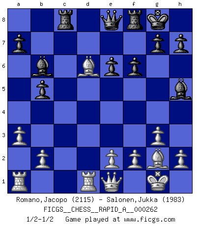 Last move : 1/2-1/2 2021 January 20 7:41:0 [Event "FICGS__CHESS__RAPID_A__000262"] [Site "FICGS"] [Date "2020.10.24"] [Round "1"] [White "Romano,Jacopo"] [Black "Salonen,Jukka"] [Result "1/2-1/2"] [WhiteElo "2115"] [BlackElo "1983"] 1.d4 d5 2.c4 e6 3.g3 Nf6 4.Nf3 dxc4 5.Bg2 c5 6.O-O Nc6 7.Qa4 Bd7 8.Qxc4 b5 9.Qd3 Rc8 10.dxc5 Bxc5 11.Nc3 Nb4 12.Qd2 Nbd5 13.Nxd5 Nxd5 14.Ne5 O-O 15.a3 Be8 16.Rd1 f6 17.Nd3 Bb6 18.Qe1 Bh5 19.Nf4 Nxf4 20.Bxf4 Qe8 21.Bd6 1/2-1/2 Follow this game move after move (download)In a gambit you give up a Pawn for the sake of getting a lost game. (Samuel Standige Boden) Kritik überlasse ich den Spießern. Ich zeige nichts, wofür ich mich schämen muss. (Alexandra Kosteniuk) El Ajedrez es una manera fabulosa para que los niños aprendan a autovalorarse y a autoestimarse. (Saudin Robovic) Aux échecs, les retours au sommet sont rares : les dommages psychologiques consécutifs à une défaite sont trop sévères. (Daily Telegraph) If we knew what we were doing, we would not call it research. (Albert Einstein)