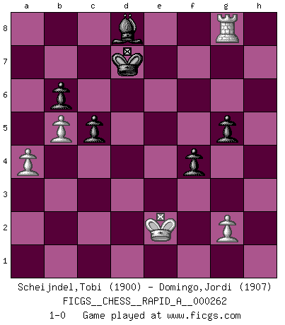 Last move : 1-0 2021 February 7 17:24:31 [Event "FICGS__CHESS__RAPID_A__000262"] [Site "FICGS"] [Date "2020.10.24"] [Round "1"] [White "Scheijndel,Tobi"] [Black "Domingo,Jordi"] [Result "1-0"] [WhiteElo "1900"] [BlackElo "1907"] 1.Nf3 b5 2.e4 Bb7 3.Bxb5 Bxe4 4.d4 e6 5.O-O Nf6 6.c4 Be7 7.Nc3 Bb7 8.Re1 O-O 9.Ba4 d6 10.d5 e5 11.c5 dxc5 12.Nxe5 Nxd5 13.Qf3 Bf6 14.Bf4 Nxf4 15.Qxb7 Bxe5 16.Qxa8 Nd3 17.Rad1 Bxh2+ 18.Kf1 Qd4 19.Re3 c4 20.Bc2 Bd6 21.Bxd3 cxd3 22.Qd5 Qb6 23.Qb5 Nc6 24.Rexd3 Ne5 25.Rd4 f6 26.Qxb6 axb6 27.Nb5 Bc5 28.Rd8 c6 29.Nc7 Be7 30.Rxf8+ Kxf8 31.b3 g5 32.f4 gxf4 33.Ne6+ Kf7 34.Nxf4 f5 35.a4 Ng6 36.Nxg6 hxg6 37.Rd7 Ke6 38.Rc7 Kd6 39.Rb7 Bd8 40.Rg7 g5 41.Rg8 Kd7 42.b4 c5 43.b5 f4 44.Ke2 1-0 Follow this game move after move (download)When I have White, I win because I am white; When I have Black, I win because I am Bogolyubov. (Bogolyubov) Die Fehler sind da, Sie warten nur darauf gemacht zu werden. (Savielly Grigorievitsch Tartakower) Hay dos clases de hombres: aquellos que se conforman en dejarse llevar por las circunstancias y que juegan barajas y aquellos decididos a controlar las circunstancias y que juegan al Ajedrez. (Mortimer Collins) Un journaliste : 'Vous préférez avoir une dame de plus sur l'échiquier ou au lit ?' Boris Spassky : 'Ca dépend de la position.' Panic is a sudden desertion of us, an a going over to the enemy of our imagination. (Christian Nevell Bovee)