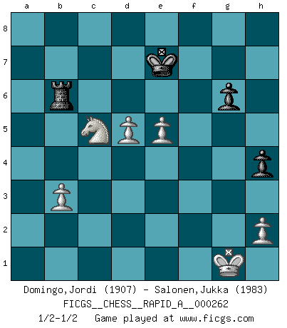 Last move : 1/2-1/2 2021 March 5 17:41:41 [Event "FICGS__CHESS__RAPID_A__000262"] [Site "FICGS"] [Date "2020.10.24"] [Round "1"] [White "Domingo,Jordi"] [Black "Salonen,Jukka"] [Result "1/2-1/2"] [WhiteElo "1907"] [BlackElo "1983"] 1.e4 e5 2.Nf3 Nc6 3.Bc4 Bc5 4.c3 Nf6 5.d4 exd4 6.e5 d5 7.Bb5 Ne4 8.cxd4 Bb4+ 9.Bd2 a5 10.a3 Be7 11.Be3 O-O 12.O-O f6 13.Nc3 Bg4 14.Ne2 Bxf3 15.gxf3 Ng5 16.Bxg5 fxg5 17.Qc2 Rb8 18.Kg2 Qd7 19.Rac1 Qe6 20.Rg1 Bd8 21.Bd3 g6 22.Qd2 a4 23.Bc2 Ra8 24.Qd3 Be7 25.Kh1 Na5 26.Bxa4 c6 27.Qc3 b5 28.Bb3 Kh8 29.Rg3 Nc4 30.Qc2 Kg7 31.a4 h5 32.axb5 cxb5 33.f4 gxf4 34.R3g1 Rac8 35.Qd3 Kh6 36.Bc2 Rc6 37.b3 Na3 38.Bd1 b4 39.Qf3 Rxc1 40.Nxc1 Qf5 41.Qxd5 f3 42.Na2 Nc2 43.Qc4 Ne3 44.Qc1 Bg5 45.Rxg5 Kxg5 46.Qxe3+ Kh4 47.Bxf3 Qxf3+ 48.Kg1 Qxe3 49.fxe3 Rb8 50.e6 Kg5 51.d5 Kf6 52.e4 Ke5 53.e7 Kd6 54.Nxb4 Kd7 55.Na6 Rb6 56.Nc5+ Kxe7 57.e5 h4 1/2-1/2 Follow this game move after move (download)When you don't know what to play, wait for an idea to come into your opponent's mind. You may be sure that idea will be wrong. (Siegbert Tarrasch) Ich kämpfe solange mein Gegner einen Fehler machen kann. (Emanuel Lasker) Hasta este punto, las blancas han seguido un análisis bien conocido. Pero ahora el hace un error fatal: empieza a usar su propia cabeza. (Siegbert Tarrasch) Le pion, dans sa simplicité, marche droit devant lui, mais lorsqu'il prend, il le fait obliquement? Ainsi l'homme, tant qu'il reste pauvre, marche dans la droiture et vit honnêtement, mais lorsqu'il recherche les honneurs, il flatte, se parjure et, par les voies obliques, cherche une position supérieure sur l'échiquier du monde. (Jean de Galles) Everybody lies. (Gregory House, House M.D.)