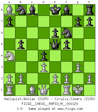 Last move : 1-0 2020 November 13 2:40:40 [Event "FICGS__CHESS__RAPID_M__000120"] [Site "FICGS"] [Date "2020.10.26"] [Round "1"] [White "Hallqvist,Niklas"] [Black "Cirulis,Ilmars"] [Result "1-0"] [WhiteElo "2109"] [BlackElo "2190"] 1.c4 f5 2.g3 c6 3.Bg2 Nf6 4.Nf3 e6 5.Nc3 d5 6.O-O d4 7.Na4 b5 8.cxb5 cxb5 9.Ne5 Qc7 10.Bxa8 Qxe5 11.d3 1-0 Follow this game move after move (download)Methodical thinking is of more use in Chess than inspiration. (C. J. S. Purdy) Zum Sieg gelangt man nicht, wenn man gut, sondern nur wenn man besser spielt (Savielly Grigorievitsch Tartakower) El Ajedrez, como cualquier otra actividad creativa, puede existir solo a través de méritos combinados de aquellos que tienen talento creativo y de aquellos que tienen la habilidad de organizar un trabajo creativo. (Mikhail Botvinnik) Je fais ceci parce que dans cinquante coups j'obtiendrai cela; je m'appelle Mikhail Moisevitch Botvinnik. (Botvinnik) Creativity is allowing yourself to make mistakes. Art is knowing which ones to keep. (Scott Adams)
