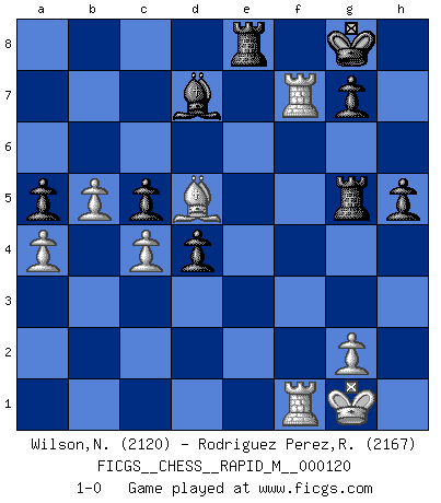 Last move : 1-0 2021 January 11 12:36:11 [Event "FICGS__CHESS__RAPID_M__000120"] [Site "FICGS"] [Date "2020.10.26"] [Round "1"] [White "Wilson,Norman"] [Black "Rodriguez Perez,Rene"] [Result "1-0"] [WhiteElo "2120"] [BlackElo "2167"] 1.e4 e6 2.d4 d5 3.Nc3 Nf6 4.e5 Nfd7 5.f4 c5 6.Nf3 Nc6 7.Be3 Be7 8.a3 O-O 9.dxc5 Bxc5 10.Bxc5 Nxc5 11.b4 Nd7 12.Bd3 h6 13.O-O a5 14.b5 Ne7 15.Na4 b6 16.c3 Bb7 17.Rc1 Rc8 18.h3 Nc5 19.Nxc5 bxc5 20.Rf2 d4 21.c4 Nf5 22.Nh2 Kh8 23.Qc2 Ne3 24.Qe2 Rc7 25.Re1 Rd7 26.Qh5 Qe8 27.f5 exf5 28.Rxf5 Re7 29.Ng4 Nxg4 30.hxg4 Re6 31.Qh2 Kg8 32.g5 Bc8 33.Qg3 h5 34.Rf6 Qe7 35.a4 Bd7 36.Be4 Re8 37.Ref1 Rxe5 38.Rxf7 Qxg5 39.Qxg5 Rxg5 40.Bd5 1-0 Follow this game move after move (download)I have added these principles to the law: get the Knights into action before both Bishops are developed. (Emanuel Lasker) Man braucht nicht immer den besten Zug zu spielen: Ein Zug muß aktiv, unternehmungslustig, korrekt und schön sein. (David Bronstein) Fischer no está bajo la obligación de nadie. (Joseph Platz) Aux échecs, l'amour-propre est satisfait quand on remporte la victoire, mais il n'y a pas de honte à être battu. (Benjamin Franklin) You think that education is too expensive ? Try ignorance. (Derek Bok)