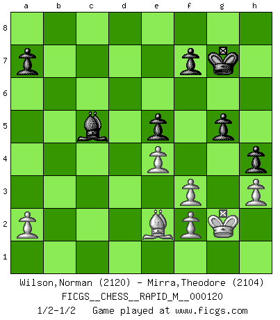 Last move : 1/2-1/2 2020 November 5 14:6:52 [Event "FICGS__CHESS__RAPID_M__000120"] [Site "FICGS"] [Date "2020.10.26"] [Round "1"] [White "Wilson,Norman"] [Black "Mirra,Theodore"] [Result "1/2-1/2"] [WhiteElo "2120"] [BlackElo "2104"] 1.d4 Nf6 2.c4 e6 3.Nf3 d5 4.Nc3 c6 5.Bg5 h6 6.Bxf6 Qxf6 7.e3 Nd7 8.Bd3 dxc4 9.Bxc4 g6 10.O-O Bg7 11.e4 e5 12.d5 Nb6 13.Bb3 Bg4 14.Rc1 O-O 15.h3 Bxf3 16.Qxf3 Qxf3 17.gxf3 Rfc8 18.dxc6 bxc6 19.Na4 Bf8 20.Rfd1 Rc7 21.Rd2 c5 22.Nc3 c4 23.Nd5 Nxd5 24.Rxd5 Rac8 25.Ba4 Rc5 26.Rxc5 Rxc5 27.Bd1 Kg7 28.Be2 c3 29.bxc3 h5 30.Kg2 Rc8 31.Kg3 Bb4 32.c4 Bc5 33.Rd1 h4+ 34.Kg2 g5 35.Rd5 Bd4 36.c5 Rxc5 37.Rxc5 Bxc5 1/2-1/2 Follow this game move after move (download)Chess is a beautiful mistress. (Bent Larsen) Ein bischen Romantik kann weder im Schach noch in der Liebe schaden. Also versuche ich mich ab und zu daran zu erinnern. (Nigel Short) Durante una competencia de Ajedrez, un Maestro de Ajedrez deberá ser una combinación de presa de caza y un Monge. (Alexander Alekhine) Mon pion favori sur ma case favorite ! Bronstein en parlant d'un coup de pion en h5 quand il avait les Noirs. Information on the Internet is subject to the same rules and regulations as conversation at a bar. (George Lundberg)