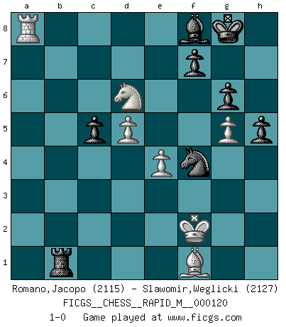 Last move : 1-0 2021 March 16 11:11:14 [Event "FICGS__CHESS__RAPID_M__000120"] [Site "FICGS"] [Date "2020.10.26"] [Round "1"] [White "Romano,Jacopo"] [Black "Slawomir,Weglicki"] [Result "1-0"] [WhiteElo "2115"] [BlackElo "2127"] 1.d4 Nf6 2.c4 e6 3.g3 c5 4.d5 exd5 5.cxd5 g6 6.Nc3 Bg7 7.Bg2 d6 8.Nf3 O-O 9.O-O Re8 10.Nd2 a6 11.a4 Nbd7 12.h3 Rb8 13.Nc4 Ne5 14.Na3 Nh5 15.e4 Bd7 16.a5 b5 17.axb6 Bb5 18.Naxb5 axb5 19.Nxb5 Qxb6 20.Na3 Qb3 21.g4 Nf6 22.Qxb3 Rxb3 23.Kh1 Ra8 24.Bf4 Nfd7 25.Bxe5 Nxe5 26.f4 Nd3 27.Nc4 Rxa1 28.Rxa1 Nxf4 29.Ra8+ Bf8 30.Nxd6 Rxb2 31.Bf1 Rb1 32.Kg1 Nxh3+ 33.Kg2 Nf4+ 34.Kf2 h5 35.g5 1-0 This chess game has been lost on time (started : 2020.10.26 14:21:23) Follow this game move after move (download)I like the moment when I break a man's ego. (Bobby Fischer) Ich würde mich als ganz normalen Jungen bezeichnen [Im Alter von 12]. (Sergej Karjakin) Coloca el contenido del tablero de Ajedrez en un sombrero, agita las piezas vigorosamente, derrámalas en el tablero desde una altura de medio metro y así obtienes el estilo de Wilhelm Steinitz. (H. E. Bird) Tous ces prétendus hommes politiques sont les pions, les Cavaliers, les Tours ou les Fous d'une partie d'échecs qui se jouera tant qu'un hasard ne renversera pas l'échiquier. (Honoré de Balzac) A specialist learns more and more about less and less until he knows everything about nothing. (Nicholas Murray Butler)