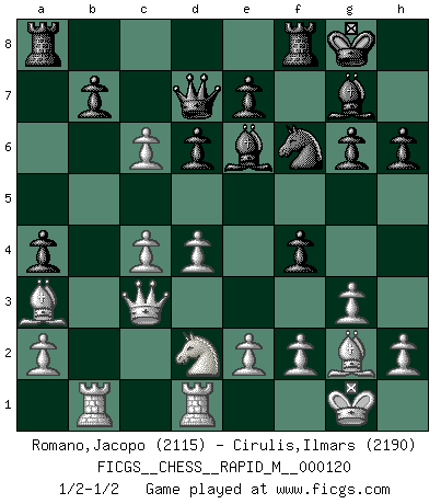 Last move : 1/2-1/2 2021 January 19 14:1:26 [Event "FICGS__CHESS__RAPID_M__000120"] [Site "FICGS"] [Date "2020.10.26"] [Round "1"] [White "Romano,Jacopo"] [Black "Cirulis,Ilmars"] [Result "1/2-1/2"] [WhiteElo "2115"] [BlackElo "2190"] 1.d4 f5 2.c4 Nf6 3.Nf3 g6 4.g3 Bg7 5.Bg2 O-O 6.O-O d6 7.Nc3 c6 8.b3 Qc7 9.Ba3 Ne4 10.Qc2 Nxc3 11.Qxc3 Nd7 12.Ng5 Nf6 13.Rfd1 a5 14.Rab1 h6 15.Nf3 a4 16.b4 Be6 17.Nd2 f4 18.b5 Qd7 19.bxc6 1/2-1/2 Follow this game move after move (download)Chess holds its master in its own bonds, shackling the mind and brain so that the inner freedom of the very strongest must suffer. (Albert Einstein) Die unerbitterlichsten Regeln im Schach sind die Ausnahmen. (Savielly Grigorievitsch Tartakower) Si tu oponente no puede hacer nada activo, entonces no apures la posición; En vez de eso, dejalo estar sentado ahí, sufriendo y rogandote por un empate. (Jeremy Silman) Tout change constamment, y compris dans le monde des Echecs. (Botvinnik) Perhaps the current trend of many chess professionals taking up the more lucrative pastime of poker is not a wholly negative one. It may not be too late for humans to relearn how to take risks in order to innovate and thereby maintain the advanced lifestyles we enjoy. And if it takes a poker-playing supercomputer to remind us that we can't enjoy the rewards without taking the risks, so be it. (The Chess Master and the Computer, by Garry Kasparov - 2010)