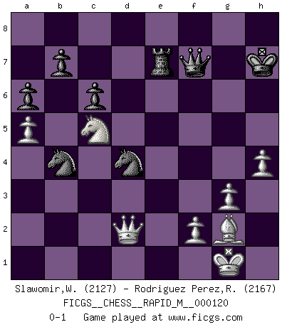 Last move : 0-1 2021 March 9 15:32:1 [Event "FICGS__CHESS__RAPID_M__000120"] [Site "FICGS"] [Date "2020.10.26"] [Round "1"] [White "Slawomir,Weglicki"] [Black "Rodriguez Perez,Rene"] [Result "0-1"] [WhiteElo "2127"] [BlackElo "2167"] 1.d4 Nf6 2.c4 g6 3.g3 d5 4.cxd5 Nxd5 5.Bg2 Bg7 6.Nf3 Nc6 7.e4 Nb6 8.d5 Na5 9.Qc2 f5 10.Ng5 h6 11.Ne6 Bxe6 12.dxe6 Nc6 13.exf5 Nd4 14.Qd1 Nxf5 15.Qg4 O-O 16.O-O Kh7 17.Nc3 c6 18.Rd1 Qc8 19.Qe4 Rf6 20.Re1 Qg8 21.h4 Kh8 22.Bf4 Raf8 23.Be5 Rxe6 24.Bxg7+ Nxg7 25.Qb4 Qf7 26.Ne4 Kg8 27.Rad1 Nf5 28.a4 Re5 29.b3 Nd5 30.Qd2 Nc7 31.Qb2 Rd5 32.Rxd5 Nxd5 33.Nc5 e6 34.b4 Re8 35.a5 a6 36.Re5 Re7 37.Qe2 Nxb4 38.Rxe6 Nd4 39.Rxg6+ Kh7 40.Rxh6+ Kxh6 41.Qd2+ Kh7 0-1 This chess game has been lost on time (started : 2020.10.26 14:21:23) Follow this game move after move (download)It's just you and your opponent at the board and you're trying to prove something. (Bobby Fischer) Ich war schon mal beim Dopingtest. Da musste ich Urin abgeben, während Dritte zusahen. (Elisabeth Pähtz) El Ajedrez detiene a su maestro dentro de sus propios vínculos, encadenando la mente y el cerebro, por lo que la libertad interior del mas fuerte debe sufrir. (Albert Einstein) Il s'avisa de me proposer d'apprendre les échecs qu'il jouait un peu... me voilà forcené des échecs. J'achète un échiquier, je m'enferme dans ma chambre, j'y passe des jours et des nuits à vouloir apprendre par cur toutes les parties. (Jean-Jacques Rousseau, Confessions) In fact if nothing is done against this teddy bear, hereby I announce that I would quit chess, rapid chess, blitz chess, postal chess, email chess, server chess and correspondence chess I will then switch to a table game where teddy bears aren't going to be seen for a while, like Poker, or Roulette, all 18+ games. (Elmer Valderrama)