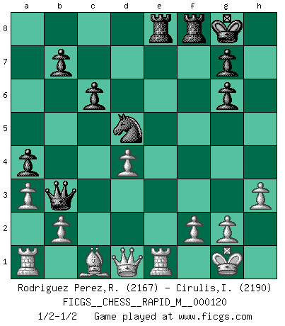 Last move : 1/2-1/2 2021 January 9 17:40:52 [Event "FICGS__CHESS__RAPID_M__000120"] [Site "FICGS"] [Date "2020.10.26"] [Round "1"] [White "Rodriguez Perez,Rene"] [Black "Cirulis,Ilmars"] [Result "1/2-1/2"] [WhiteElo "2167"] [BlackElo "2190"] 1.e4 e5 2.Nf3 Nc6 3.Bc4 Bc5 4.d3 Nf6 5.Nbd2 O-O 6.c3 d6 7.h3 a5 8.O-O Ba7 9.Re1 Be6 10.Bb5 Ne7 11.d4 Ng6 12.Ba4 Nh5 13.Bc2 Qd7 14.Nf1 Nhf4 15.Ne3 exd4 16.Nxd4 Bxd4 17.cxd4 d5 18.exd5 Nxd5 19.Bd2 c6 20.a3 a4 21.Nc4 Qd8 22.Ne5 Qb6 23.Bc1 Qb5 24.Nxg6 hxg6 25.Bxg6 fxg6 26.Rxe6 Rae8 27.Re1 Qb3 1/2-1/2 Follow this game move after move (download)The mistakes are there, waiting to be made. (Savielly Tartakower) Nicht daß Diemer aus Opportunismus Mitglied der NSDAP geworden wäre. Er war ein Fanatiker, in allem, was er tat. (Hans Ree) El Ajedrez es un invernadero donde los frutos del carácter pueden madurar mas completamente que en la vida. (Edward Morgan Foster) La tactique, c'est ce que vous faites quand il y a quelque chose à faire; la stratégie, c'est ce que vous faites quand il n'y a rien à faire. (Savielli Tartacower) I couldn't make any sense out of what this particular thread is about. It sounds like R2 D2 computer speaking. A space fight ?!? Some 'command' problems in Moscow ? Some killers & narcotic addicts attacking some game & a god wannabe ?? (Dinesh De Silva, lost in a russian conflict in FICGS forum)