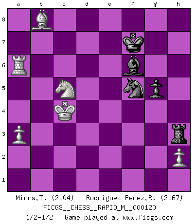 Last move : 1/2-1/2 2021 February 2 17:37:47 [Event "FICGS__CHESS__RAPID_M__000120"] [Site "FICGS"] [Date "2020.10.26"] [Round "1"] [White "Mirra,Theodore"] [Black "Rodriguez Perez,Rene"] [Result "1/2-1/2"] [WhiteElo "2104"] [BlackElo "2167"] 1.d4 Nf6 2.c4 g6 3.Nc3 d5 4.cxd5 Nxd5 5.e4 Nxc3 6.bxc3 Bg7 7.Bc4 c5 8.Ne2 O-O 9.O-O Nc6 10.Be3 Bg4 11.f3 Na5 12.Bxf7+ Rxf7 13.fxg4 Rxf1+ 14.Kxf1 Qd6 15.Kg1 Qe6 16.Qd3 Qc4 17.Qxc4+ Nxc4 18.Bf2 cxd4 19.cxd4 e5 20.d5 b5 21.Re1 Nd6 22.Nc1 Rc8 23.Nb3 Rc4 24.Bxa7 Nxe4 25.Bb8 Nf6 26.Rxe5 Nxg4 27.Re6 Kf7 28.Kf1 Nf6 29.Rb6 Nxd5 30.Rxb5 Ne3+ 31.Kf2 Nf5 32.Rd5 h5 33.Ke2 Ra4 34.Rd7+ Ke8 35.Rd2 Kf7 36.Rd7+ Ke8 37.Rd2 Kf7 38.Kd3 g5 39.Rc2 Bf6 40.Rc7+ Kg6 41.Ra7 Rg4 42.Ra6 Kf7 43.Ra7+ Kg6 44.Ra6 Kf7 45.g3 h4 46.gxh4 Rxh4 47.Ra7+ Kg6 48.Ra6 Kf7 49.Bc7 Rg4 50.Ra7 Ne7 51.Bg3 Kg6 52.a3 Nf5 53.Bb8 Rh4 54.Ra6 Rh3+ 55.Kc4 Kf7 56.Nc5 1/2-1/2 Follow this game move after move (download)The Pin is mightier than the sword. (Fred Reinfeld) Auf Remis zu spielen ist gewissermaßen ein Verbrechen gegen das Schachspiel. (Mikhail Nekhemyevich Tal) Un jugador que trata de regresar una movida en el Ajedrez es un futuro carterista. (Richard Fenton) Il n'y a pas de prix trop élevé au scalp de l'ennemi. (Koblentz) When you have everything, sometimes it feels like nothing. (Horatio Caine, C.S.I. Miami)