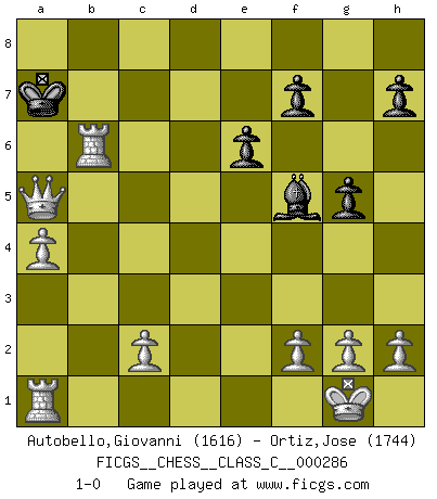 Last move : 1-0 2021 May 29 1:27:42 [Event "FICGS__CHESS__CLASS_C__000286"] [Site "FICGS"] [Date "2020.10.27"] [Round "1"] [White "Autobello,Giovanni"] [Black "Ortiz,Jose"] [Result "1-0"] [WhiteElo "1616"] [BlackElo "1744"] 1.e4 c5 2.Nf3 Nc6 3.d4 d5 4.exd5 Qxd5 5.Nc3 Qd8 6.Be3 b6 7.Bb5 Bd7 8.O-O Nf6 9.dxc5 Qc7 10.cxb6 axb6 11.Qd2 O-O-O 12.Ba6+ Kb8 13.Nb5 Bf5 14.Qe2 e6 15.Nxc7 Kxc7 16.Qc4 Nd7 17.Bb5 Bc5 18.Bxc5 Nxc5 19.Bxc6 Kxc6 20.b4 Rd5 21.bxc5 Rxc5 22.Nd4+ Kb7 23.Qb4 Rhc8 24.Rfb1 R8c6 25.Nxc6 Rxc6 26.a4 Rc5 27.Qxc5 g5 28.Rxb6+ Ka7 29.Qa5+ 1-0 Follow this game move after move (download)I know people who have all the will in the world, but still can't play good Chess. (Bobby Fischer) Obwohl ich alt bin, darf mir niemand den Finger in den Mund stecken, sonst beisse ich. (Wilhelm Steinitz) Todavía soy una víctima del Ajedrez. Tiene toda la belleza del arte y mucho mas. No puede ser comercializado. El Ajedrez es mas puro que el arte en su posición social. (Marcel Duchamp) Toutes choses étant égales, c'est la conviction qui gagne. Alliée à une volonté de vaincre, elle sert de détonateur, suscite des idées, disperse les doutes et aide à penser clairement. (Robert Fischer) Knowledge rests not upon truth alone, but upon error also. (Carl G. Jung)