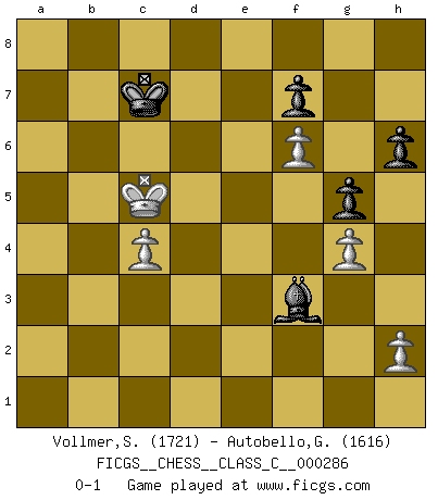 Last move : 0-1 2021 July 25 11:5:2 [Event "FICGS__CHESS__CLASS_C__000286"] [Site "FICGS"] [Date "2020.10.27"] [Round "1"] [White "Vollmer,Steve"] [Black "Autobello,Giovanni"] [Result "0-1"] [WhiteElo "1721"] [BlackElo "1616"] 1.e4 e5 2.Nf3 Nc6 3.Bb5 a6 4.Ba4 Nf6 5.d4 exd4 6.O-O b5 7.Bb3 Be7 8.Nxd4 Nxd4 9.Qxd4 O-O 10.a4 Bb7 11.e5 Ne8 12.Nc3 Kh8 13.axb5 axb5 14.Bf4 c5 15.Qe3 c4 16.Ba2 d6 17.Nxb5 dxe5 18.Bxc4 exf4 19.Qxf4 Rxa1 20.Rxa1 Bf6 21.c3 Bg5 22.Qg4 Qf6 23.Re1 Bc6 24.Nd4 Bb7 25.Qe2 Nd6 26.Bd3 Bf4 27.Qe7 Qxe7 28.Rxe7 Re8 29.Rxe8+ Nxe8 30.g3 Be5 31.f4 Bc7 32.Kf1 Kg8 33.Ke2 h6 34.Ke3 Kf8 35.Be4 Ba6 36.b4 Nd6 37.Bd5 Nc4+ 38.Bxc4 Bxc4 39.Ke4 Bb6 40.g4 Bd8 41.Nc6 Bf6 42.Ne5 Be6 43.f5 Bc8 44.b5 Bb7+ 45.Kd4 Ke7 46.c4 Bf3 47.b6 Bxe5+ 48.Kxe5 Kd7 49.f6 g5 50.Kd4 Kc6 51.b7 Kxb7 52.Kc5 Kc7 0-1 Follow this game move after move (download)Fischer is the strongest player in the world. In fact, the strongest player who ever lived. (Larry Evans) Gewöhnliche Menschen denken nur daran, wie sie ihre Zeit verbringen. Ein intelligenter Mensch versucht, sie auszunutzen. (Arthur Schopenhauer) Todo lo que importa ante el tablero de Ajedrez son buenas jugadas. (Bobby Fischer) Je fais ceci parce que dans cinquante coups j'obtiendrai cela; je m'appelle Mikhail Moisevitch Botvinnik. (Botvinnik) Pretend inferiority and encourage his arrogance. (Sun Tzu)