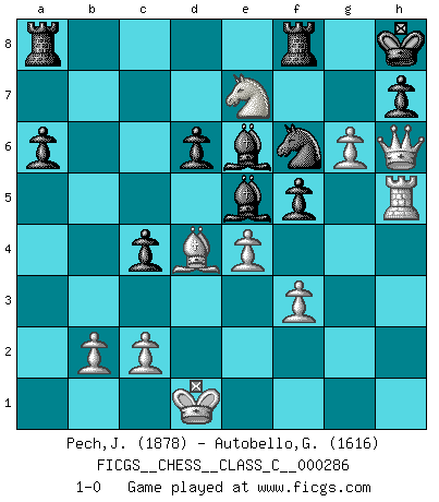 Last move : 1-0 2021 July 5 20:41:13 [Event "FICGS__CHESS__CLASS_C__000286"] [Site "FICGS"] [Date "2020.10.27"] [Round "1"] [White "Pech,Jaroslav"] [Black "Autobello,Giovanni"] [Result "1-0"] [WhiteElo "1878"] [BlackElo "1616"] 1.e4 c5 2.Nf3 d6 3.d4 cxd4 4.Nxd4 Nf6 5.Nc3 a6 6.Be3 Nc6 7.f3 g6 8.Qd2 Bg7 9.O-O-O O-O 10.g4 Nxd4 11.Bxd4 b5 12.h4 Qa5 13.g5 Ne8 14.Nd5 Qxa2 15.Nxe7+ Kh8 16.Qc3 Be6 17.h5 gxh5 18.Rxh5 f5 19.Bc4 Qa1+ 20.Kd2 Qxd1+ 21.Kxd1 bxc4 22.Qd2 Be5 23.g6 Nf6 24.Qh6 1-0 This chess game has been lost on time (started : 2020.10.27 16:27:0) Follow this game move after move (download)When your house is on fire, you can't be bothered with the neighbors. Or, as we say in Chess, if your King is under attack you don't worry about losing a Pawn on the Queen's side. (Gary Kasparov) Sehr viele beherrschen heutzutage das große Einmalseins des Schachspiels und kennen sogar dessen Logarithmentafeln auswendig - deshalb sollte man hin und wieder zu beweisen trachten, dass zwei mal zwei auch fünf sein kann. (Mikhail Nekhemyevich Tal) El sobresalir en el Ajedrez es un signo de una mente intrigante. (Sir Arthur Conan Doyle) Il vaut mieux sacrifier les pièces de l'adversaire. (Xavier Tartacover) If passion drives you, let reason holds the reins. (Benjamin Franklin)