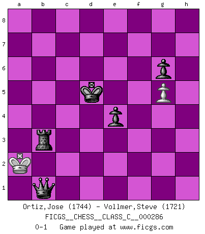 Last move : 0-1 2021 July 5 21:12:22 [Event "FICGS__CHESS__CLASS_C__000286"] [Site "FICGS"] [Date "2020.10.27"] [Round "1"] [White "Ortiz,Jose"] [Black "Vollmer,Steve"] [Result "0-1"] [WhiteElo "1744"] [BlackElo "1721"] 1.d4 Nf6 2.c4 e6 3.Qc2 d5 4.e3 a6 5.a4 Bb4+ 6.Nc3 O-O 7.Nf3 Nbd7 8.b3 Ne4 9.Bb2 f5 10.O-O-O Ndf6 11.h3 Qe7 12.c5 Nxc3 13.Bxc3 Bxc3 14.Qxc3 Bd7 15.Bd3 Ne4 16.Qb2 b6 17.b4 Bxa4 18.Bc2 Bxc2 19.Qxc2 bxc5 20.dxc5 Qf6 21.Rd3 Qa1+ 22.Qb1 Qxb1+ 23.Kxb1 Nxf2 24.Rhd1 Rfb8 25.Kc2 Rxb4 26.Kd2 Nxd1 27.Kxd1 a5 28.Nd4 Kf7 29.g4 fxg4 30.hxg4 Ra6 31.Kc2 a4 32.Ra3 Rc4+ 33.Kd3 Rxc5 34.e4 dxe4+ 35.Kxe4 Rc1 36.Rf3+ Ke7 37.Ne2 Re1 38.Kd3 Rxe2 39.Kxe2 a3 40.Rc3 a2 41.Rxc7+ Kd6 42.Rc1 a1Q 43.Rxa1 Rxa1 44.Kf3 e5 45.Ke4 g6 46.Kf3 h5 47.g5 Kd5 48.Ke3 h4 49.Kf3 Ra4 50.Ke3 h3 51.Kf3 e4+ 52.Ke3 h2 53.Kd2 h1Q 54.Kc3 Qf3+ 55.Kb2 Ra3 56.Kb1 Qd1+ 57.Kb2 Rb3+ 58.Ka2 Qb1+ 0-1 Follow this game move after move (download)Chess is like war on a board. (Bobby Fischer) Das Schachspiel ist ein See, in welchem eine Mücke baden und ein Elefant ertrinken kann. (Emanuel Lasker) Fischer era un maestro de claridad y un Rey del posicionamiento astuto. Sus oponentes podían ver hacia donde se dirigía pero eran impotentes para detenerlo. (Bruce Pandolfini) Il n'y a pas eu de défaite parce que je ne crois pas que cet ordinateur ait jamais existé. IBM a triché en refusant d'imprimer les modes de recherche de la machine. C'est évident, pendant le match, des coups décisifs ont été joués par des êtres humains. Aujourd'hui, les meilleurs spécialistes en informatique ne peuvent toujours pas expliquer comment Deep-Blue a pu jouer contre la logique des ordinateurs. IBM a gagné une guerre de communication, mais ils sont incapables de prouver que l'ordinateur a gagné tout seul. (Garry Kasparov) The greatest con, that he ever pulled... was making you believe... that he is you. (Revolver, movie)