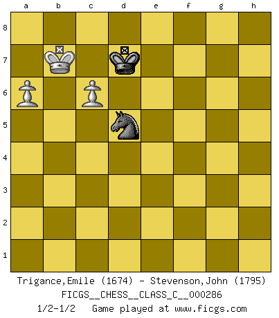 Last move : 1/2-1/2 2020 December 15 18:19:41 [Event "FICGS__CHESS__CLASS_C__000286"] [Site "FICGS"] [Date "2020.10.27"] [Round "1"] [White "Trigance,Emile"] [Black "Stevenson,John"] [Result "1/2-1/2"] [WhiteElo "1674"] [BlackElo "1795"] 1.c4 e5 2.Nc3 Nf6 3.Nf3 Nc6 4.g3 Bb4 5.Bg2 O-O 6.O-O e4 7.Ng5 Bxc3 8.bxc3 Re8 9.Qc2 Qe7 10.d3 exd3 11.exd3 h6 12.Nf3 d6 13.Rb1 Rb8 14.Re1 Qxe1+ 15.Nxe1 Rxe1+ 16.Bf1 Bh3 17.Be3 Rxf1+ 18.Rxf1 Bxf1 19.Kxf1 Ng4 20.h3 Nxe3+ 21.fxe3 a6 22.a4 a5 23.d4 b6 24.Qe4 Na7 25.Qe7 Rc8 26.Qd7 g6 27.e4 h5 28.Kf2 g5 29.e5 dxe5 30.dxe5 Rf8 31.Qxc7 Nc8 32.Ke3 Re8 33.Kd4 Kf8 34.Qc6 g4 35.hxg4 hxg4 36.Qh6+ Kg8 37.Qg5+ Kh7 38.Qxg4 Re6 39.Qe4+ Kg7 40.c5 bxc5+ 41.Kxc5 Ne7 42.c4 Ng6 43.Kd4 f6 44.exf6+ Kxf6 45.Qf3+ Ke7 46.c5 Ne5 47.Qb7+ Kf6 48.Kd5 Ng6 49.Kc4 Ne7 50.Kb5 Re1 51.Kxa5 Kf7 52.Qb3+ Re6 53.Qxe6+ Kxe6 54.Kb5 Kd7 55.Kb6 Nc8+ 56.Kb7 Ne7 57.a5 Nc6 58.Kb6 Ne5 59.g4 Nxg4 60.a6 Nf6 61.Kb7 Nd5 62.c6+ 1/2-1/2 Follow this game move after move (download)After a bad opening, there is hope for the middle game. After a bad middle game, there is hope for the endgame. But once you are in the endgame, the moment of truth has arrived. (Edmar Mednis) Gewinnen beim Schach fördert das Selbstvertrauen. Beim Sex spüre ich sowas nicht... (Garry Kasparov) Aquel que ve no otra dirección en el juego que la de dar Jaque Mate a su oponente, nunca será un buen jugador de Ajedrez. (Euwe) Votre seul travail dans les ouvertures est d'obtenir un milieu de partie jouable. (Lajos Portish) Quotation,n.: The act of repeating erroneously the words of another. The words erroneously repeated. (Ambrose Bierce, The Devil's Dictionary)