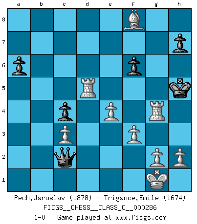 Last move : 1-0 2021 June 20 19:58:34 [Event "FICGS__CHESS__CLASS_C__000286"] [Site "FICGS"] [Date "2020.10.27"] [Round "1"] [White "Pech,Jaroslav"] [Black "Trigance,Emile"] [Result "1-0"] [WhiteElo "1878"] [BlackElo "1674"] 1.d4 e6 2.c4 Nf6 3.Nc3 Bb4 4.e3 O-O 5.Bd3 d5 6.Nf3 c5 7.O-O Nc6 8.a3 Bxc3 9.bxc3 dxc4 10.Bxc4 Qc7 11.Bd3 e5 12.Qc2 Re8 13.Nxe5 Nxe5 14.dxe5 Qxe5 15.f3 Be6 16.e4 Qc7 17.Be3 b6 18.Bb5 Bd7 19.a4 a6 20.Bxd7 Nxd7 21.Rad1 Rad8 22.Qd3 c4 23.Qd6 Qb7 24.Rd4 Nf8 25.Qxd8 Rxd8 26.Rxd8 f6 27.a5 Kf7 28.Rfd1 Qc6 29.axb6 Qb5 30.b7 Qxb7 31.Bc5 Qb3 32.Bxf8 Kg6 33.R8d7 Qc2 34.Rxg7+ Kh6 35.Rg4 Kh5 36.Rd5+ 1-0 Follow this game move after move (download)I won't play with you anymore. You have insulted my friend. - When an opponent cursed himself for a blunder. (Miguel Najdorf) Als er Schachweltmeister wurde ließ er praktisch alle stärksten Sovietspieler für sich arbeiten. Wenn ein auch nur mittelmässiger Meister ein Spezialist für eine bestimmte Eröffnung war, wurde er von Karpov gerufen. Das wurde alles geheim gehalten. (Mikhail Moiseyevich Botvinik) Cuando tu casa esta en llamas, no puedes ser molestado por tus vecinos. O, como decinos en Ajedrez, si tu Rey esta bajo ataque, no te preocupa perder un Peón del lado de la Reina. (Gary Kasparov) La solitude du joueur d'Echecs à l'approche du mat est semblable à celle du condamné. (Francis Szpiner) Dave, my mind is going. I can feel it. (HAL 9000 in 2001, a space odyssey)