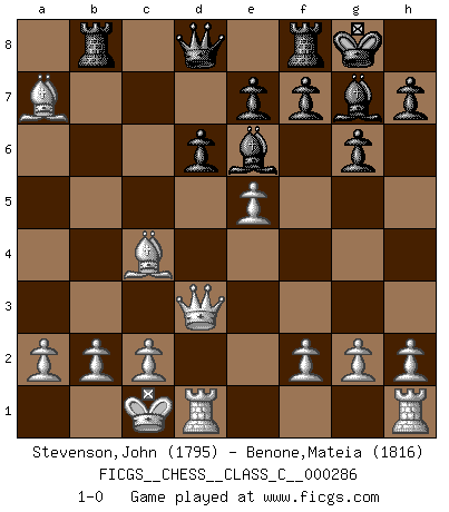 Last move : 1-0 2021 January 29 23:22:11 [Event "FICGS__CHESS__CLASS_C__000286"] [Site "FICGS"] [Date "2020.10.27"] [Round "1"] [White "Stevenson,John"] [Black "Benone,Mateia"] [Result "1-0"] [WhiteElo "1795"] [BlackElo "1816"] 1.e4 c5 2.Nf3 g6 3.d4 cxd4 4.Nxd4 Bg7 5.Nc3 Nc6 6.Be3 Nf6 7.Nxc6 bxc6 8.e5 Nd5 9.Nxd5 cxd5 10.Qxd5 Rb8 11.Bc4 O-O 12.O-O-O d6 13.Bxa7 Be6 14.Qd3 1-0 This chess game has been lost on time (started : 2020.10.27 16:27:0) Follow this game move after move (download)Castle early and often. (Rob Sillars) Je mehr wir mit Computern analysieren, desto mehr glauben wir an Verteidigung. (Vladimir Kramnik) Un entendimiento minucioso de las típicas continuaciones de mate hacen de las mas complicadas combinaciones de sacrificio que conducen hacia ellas no solo no dificiles, sino casi un asunto de rutina. (Siegbert Tarrasch) Les Echecs sont et restent toujours un combat, un combat intégral comme la boxe, la lutte ou un autre sport, et où il doit y avoir un vainqueur et un vaincu. (Joseph Emil Diemer) A clear conscience is usually the sign of a bad memory. (Unknown)