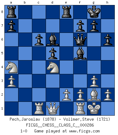 Last move : 1-0 2021 January 23 11:59:54 [Event "FICGS__CHESS__CLASS_C__000286"] [Site "FICGS"] [Date "2020.10.27"] [Round "1"] [White "Pech,Jaroslav"] [Black "Vollmer,Steve"] [Result "1-0"] [WhiteElo "1878"] [BlackElo "1721"] 1.c4 Nf6 2.Nc3 c5 3.Nf3 Nc6 4.g3 e6 5.Bg2 d5 6.cxd5 exd5 7.d4 h6 8.O-O Bd6 9.dxc5 Bxc5 10.a3 O-O 11.b4 Bb6 12.Na4 Bc7 13.Bb2 Bf5 14.Rc1 Re8 15.Bxf6 Qxf6 16.b5 Bd6 17.bxc6 bxc6 18.Nd4 1-0 Follow this game move after move (download)Chess is above all, a fight ! (Emanuel Lasker) Woher wissen wir, daß der Neanderthaler Blindschach gespielt hat? -- Bei Ausgrabungen wurden keine Schachbretter und Figuren gefunden. (Anonymous) Una buena ofensiva y una buena defensa, comienzan ambas con un buen desarrollo. (Bruce A. Moon) Les Echecs, c'est l'art de la guerre sans les charniers, c'est la résurrection des morts tombés au champ d'honneur, l'espoir perpétuel, la suprématie de l'intelligence sur la force, la culture de l'esprit. (F. Szpiner) Man with more than one clock never knows what time it is. (Chinese thought)