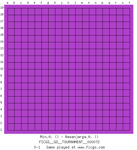 Last move : 0-1 2020 November 29 6:3:14 [Event "FICGS__GO__TOURNAMENT__000072"] [Site "FICGS"] [Date "2020.10.30"] [Round "1"] [Black "Min,Athanasia"] [White "Nasanjarga,Altanbagana"] [Result "0-1"] 0-1 This go game has been lost on time (started : 2020.10.30 1:26:40) Follow this game move after move (download)The carpenter's square becomes ko. (Anonymous) The good fighters of old first put themselves beyond the possibility of defeat, and then waited for an opportunity of defeating the enemy. (Sun Tzu)