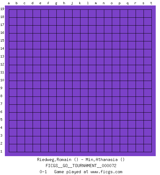 Last move : 0-1 2020 November 29 6:3:14 [Event "FICGS__GO__TOURNAMENT__000072"] [Site "FICGS"] [Date "2020.10.30"] [Round "1"] [Black "Riedweg,Romain"] [White "Min,Athanasia"] [Result "0-1"] 0-1 This go game has been lost on time (started : 2020.10.30 1:26:40) Follow this game move after move (download)The rectangular six is normally alive. (Anonymous) The Movers & Shakers of this world are those who play chess in the mornings and go to the disco in the evenings. (Dinesh De Silva)