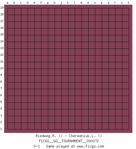 Last move : 0-1 2020 November 29 6:3:14 [Event "FICGS__GO__TOURNAMENT__000072"] [Site "FICGS"] [Date "2020.10.30"] [Round "1"] [Black "Riedweg,Romain"] [White "Cheredniuk,Liudmila"] [Result "0-1"] 0-1 This go game has been lost on time (started : 2020.10.30 1:26:40) Follow this game move after move (download)There is death in the hane. (Anonymous) The faster the computer, the slower the brain. (Thibault de Vassal)