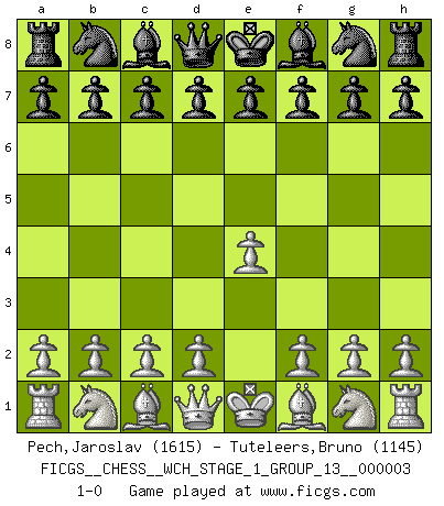 Last move : 1-0 2007 August 12 3:19:15 [Event "FICGS__CHESS__WCH_STAGE_1_GROUP_13__000003"] [Site "FICGS"] [Date "2007.07.11"] [Round "1"] [White "Pech,Jaroslav"] [Black "Tuteleers,Bruno"] [Result "1-0"] [WhiteElo "1615"] [BlackElo "1145"] 1.e4 1-0 This chess game has been lost on time (started : 2007.07.11 17:9:35) King's pawn Opening Player White won this chess game. Follow this game move after move (download)Different people feel differently about resigning. (Bobby Fischer) Um sich vor der Gefahr einer Erkältung zu schützen, sorge der wanderlustige König beizeiten für ein brauchbares Versteck. (Aaron Nimzowitsch) Cuando me preguntan: -¿Cual es el secreto que te hace hacer mejores movidas que tus oponentes?, Yo respondo: Me da gusto que me pregunten eso, porque, como veran, hay una simple razón. Yo pienso mis propias movidas y dejo a mi oponente que el piense las suyas. (Alexander Alekhine) L'ordinateur a tué l'originalité. Il n'y a plus guère d'aventures sur l'échiquier. (Jacob Murray) Pretend inferiority and encourage his arrogance. (Sun Tzu)