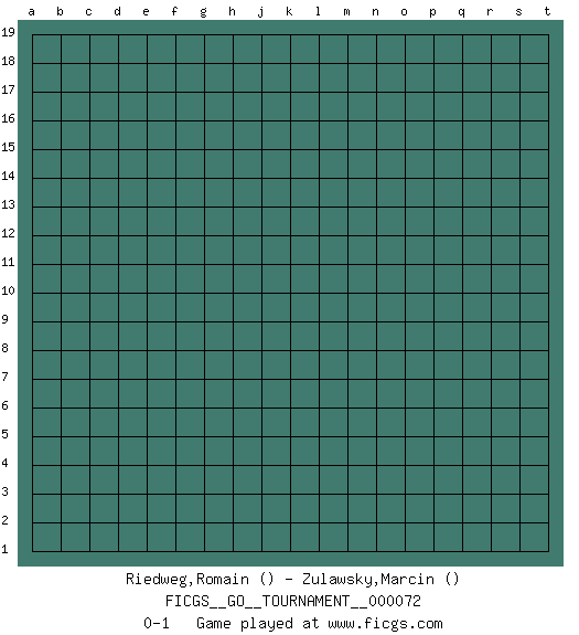 Last move : 0-1 2020 November 29 6:3:14 [Event "FICGS__GO__TOURNAMENT__000072"] [Site "FICGS"] [Date "2020.10.30"] [Round "1"] [Black "Riedweg,Romain"] [White "Zulawsky,Marcin"] [Result "0-1"] 0-1 This go game has been lost on time (started : 2020.10.30 1:26:40) Follow this game move after move (download)Attach to the strongest stone in a pincer. (Anonymous) I don't know, I don't care, and it doesn't make any difference. (Albert Einstein)